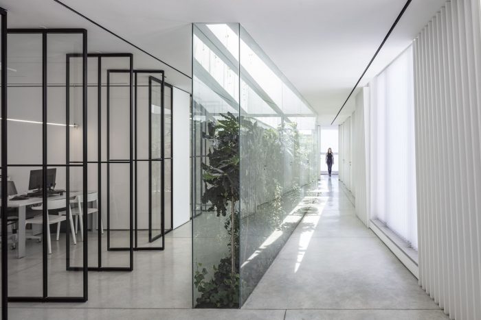 Light, air and greenery. The architectural trinity which makes a space vital and pleasant and brings peace and tranquility to the user. In order to create this atmosphere, we incorporated a 16 meter long patio in this office project, crossing through the entire space. Above the patio, a skylight which brings light and air into the office.