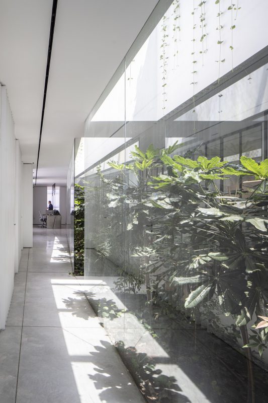 At the front, the patio becomes narrow until it almost vanishes into the space. At the center of the patio there’s an aisle. Without glass, one can touch and smell the greenery while crossing from one side of the corridor to the other. The raw and natural materials are merely the neutral background for the greenery and light, allowing minimalism to boost the holy trinity.