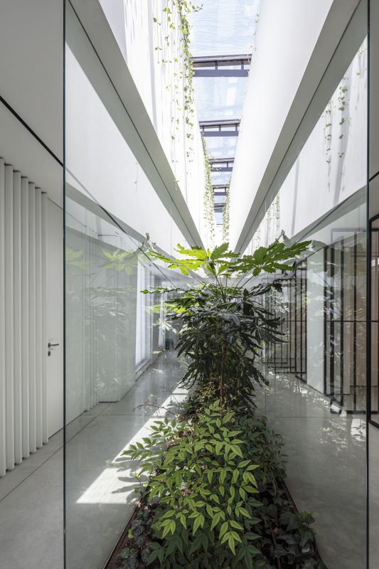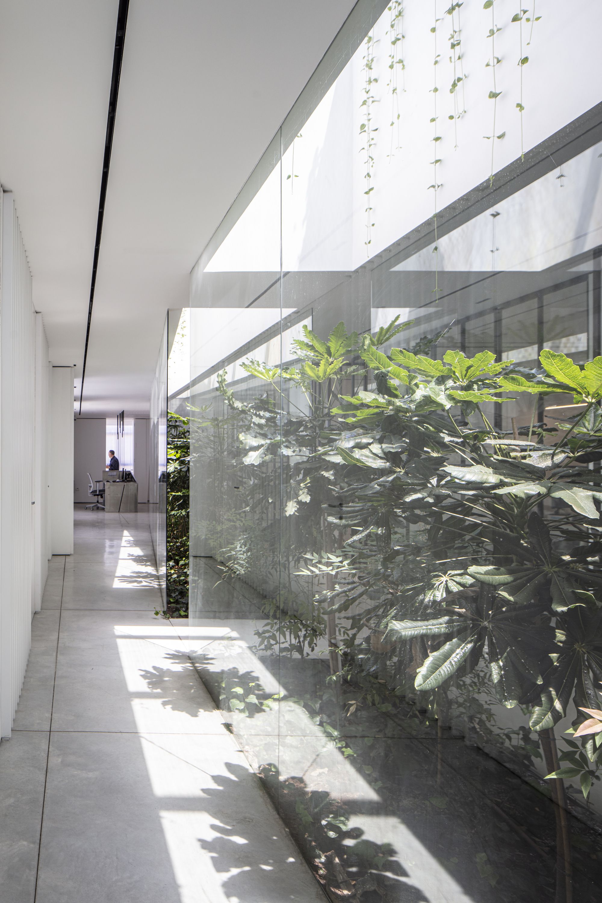 Plants are coming from the floor up, and from planters on the edges of the skylight down. All rooms are facing the patio divided by a rhythm of pivot partitions. At the back, the patio is dividing between the conference room and the CEO’s room so they both have the patio view from the inside of the room.