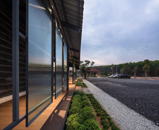 Concept and Architectural Approach – The design takes inspiration from the owner’s background — a family who has operated a complete rubber production line for generations, including plantations, sheet-rolling, and drying houses. For SA-ARD, the new café becomes a small architectural museum, showcasing the heritage of rubber-making while serving as a communal space. Over 80% of materials from the original factory were reused and reconfigured into a cleaner, contemporary composition. The low, elongated roof, deep overhangs, and exposed steel structure create a calm silhouette, anchoring the building within the wide industrial landscape.
