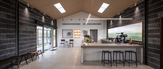 Rather than creating a café from a clean slate, the architects approached the project as an opportunity to preserve and reinterpret the site’s industrial past. The result is a single-storey, 20-meter-long structure that subtly echoes the form and atmosphere of the former rubber-processing buildings, while introducing a softer and more refined spatial language suited to today’s café culture.