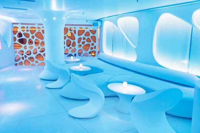 An organic, fluid design forms an artificial white landscape Which transforms in the evening, with the help of pinkish-mauve lighting, into a colorful psychedelic Bollywood inspired environment. The Smokehouse Room is a bar, restaurant and club with over 12,000 sq ft located on the 3 rd floor and terrace of Crescent Mall in Qutub. The Smokehouse Room is a very dynamic space with it’s environment changing with the passage of time, leaving the fluid and immaculate white during the day to become a sensory experience through the night, with features reminding a good part of the culture of Bollywood and India.