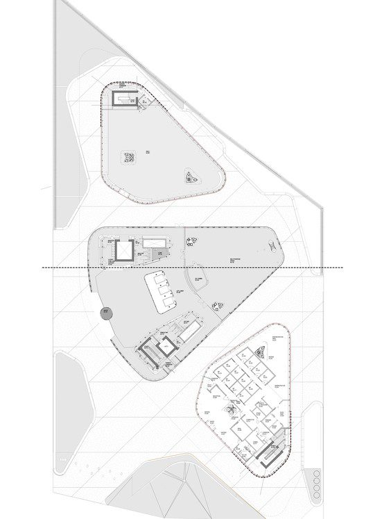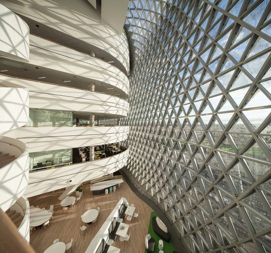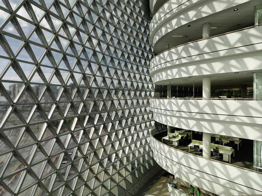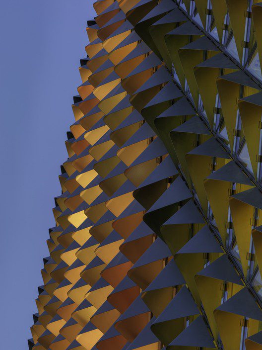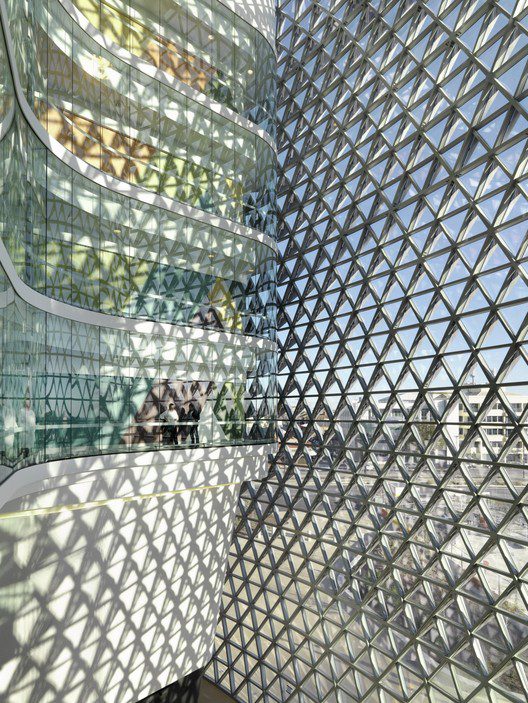 The general layout also respects the functionality of the two programs, with the provision of two atriums that can be viewed through multiple internal walkways and the use of clear facade allows it to be exhibited throughout the day. The structure also uses a typical pine cones shape as their precedence and implements a triangular-grid layered mesh which surrounds and compromises most of its exterior.