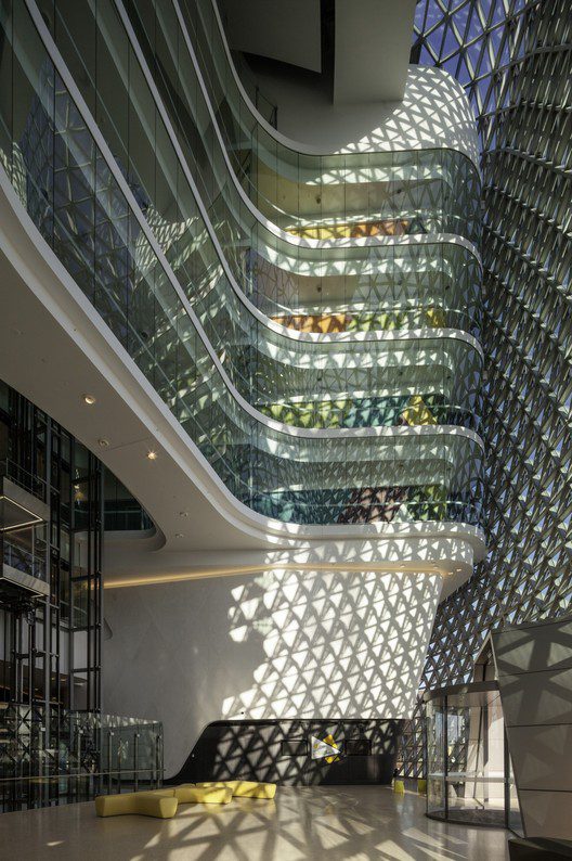 The facade’s mesh serves to respond adequately to the changing environment as if it is an entity working in relation to the sun’s position. The structure also has a colossal presence and a unique sense of scale that is constantly present unveiled to the environment. The institute goes about using many geometrical applications from exterior, triangular grid like shading devices to the interior walkways and a spiral staircase.