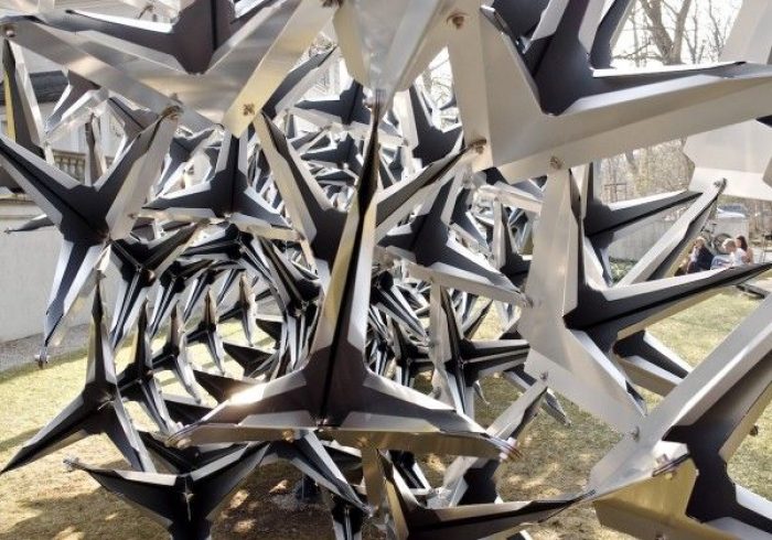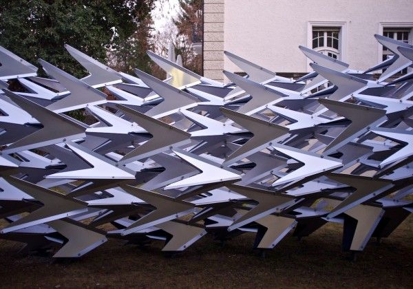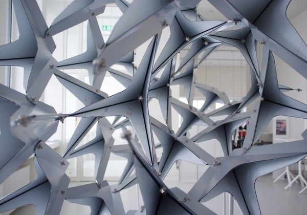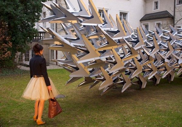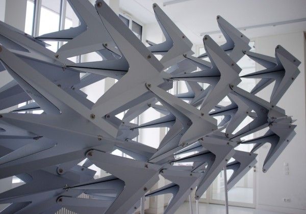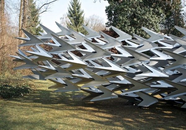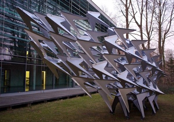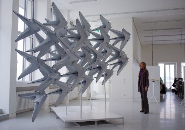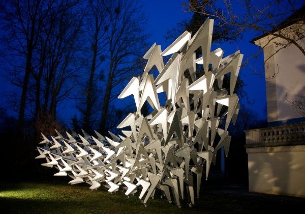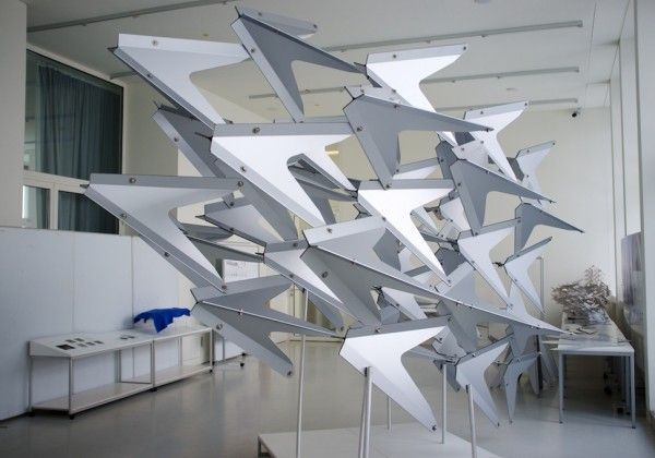 The Swarm, developed from the theme of a flying flock of birds, THE SWARM’ is a parametrical designed, free-standing, sculptural pavilion by Wieland Schmidts and His team .
