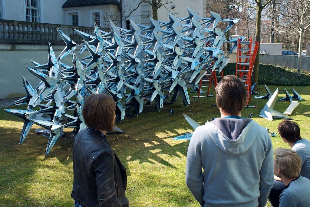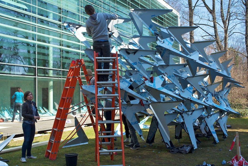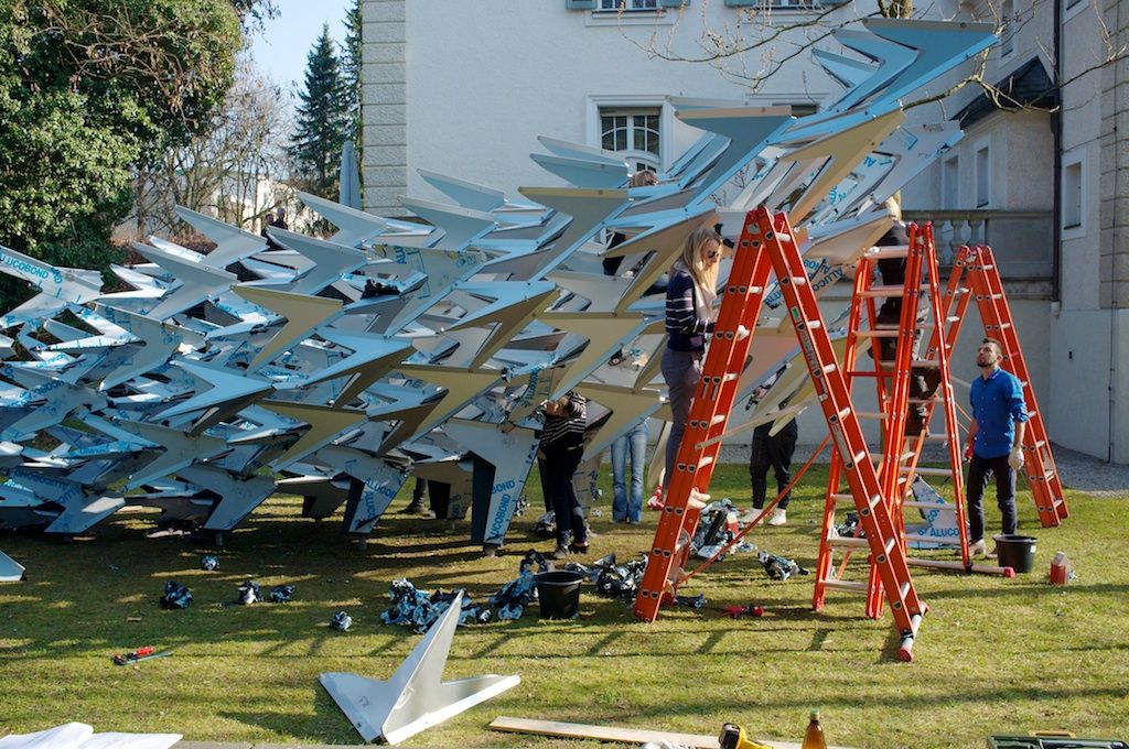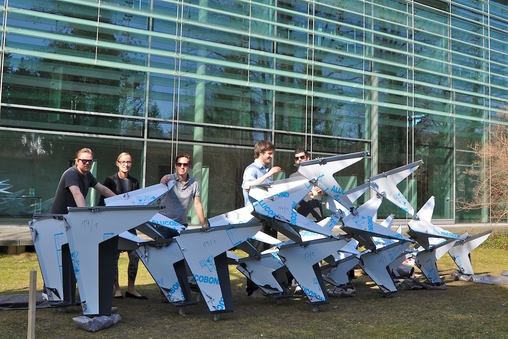 The curvy shape of the installation gives the pavilion the dynamic of a passing flock of birds which streaks the ground only for a glimpse and moves upwards to the sky in its next movement, but the focus is yet on the characteristic features of a swarm of birds.