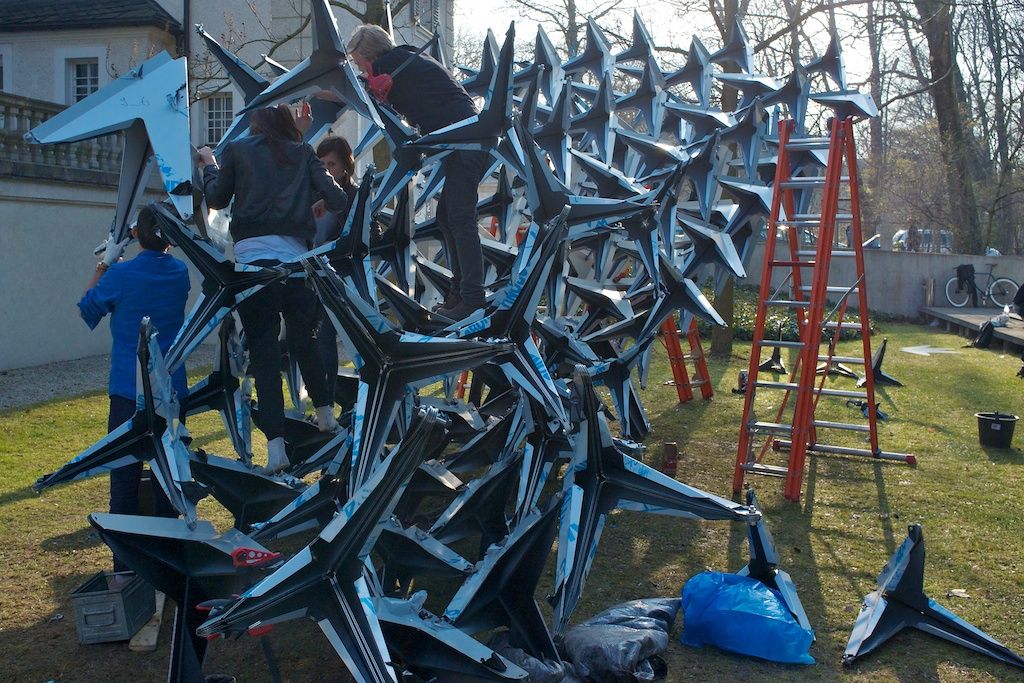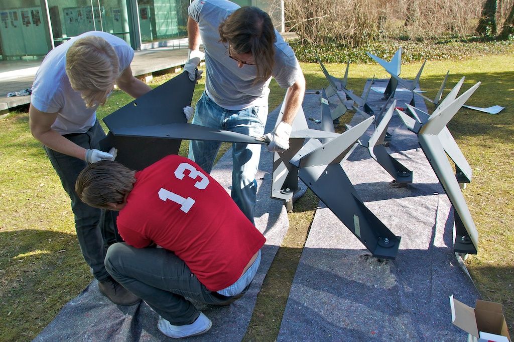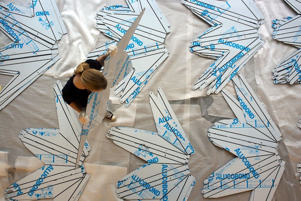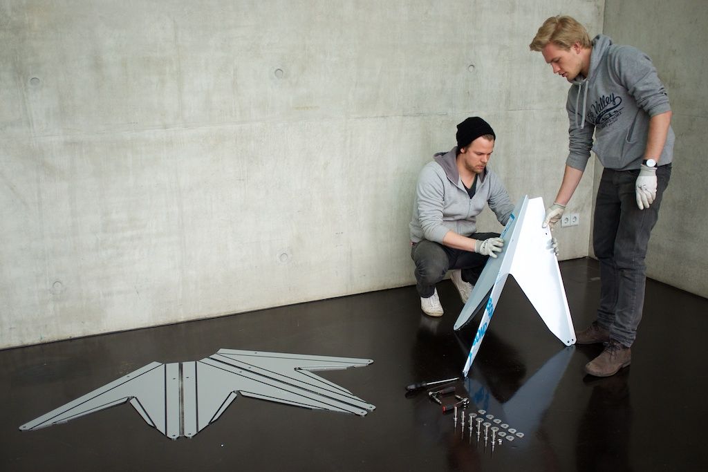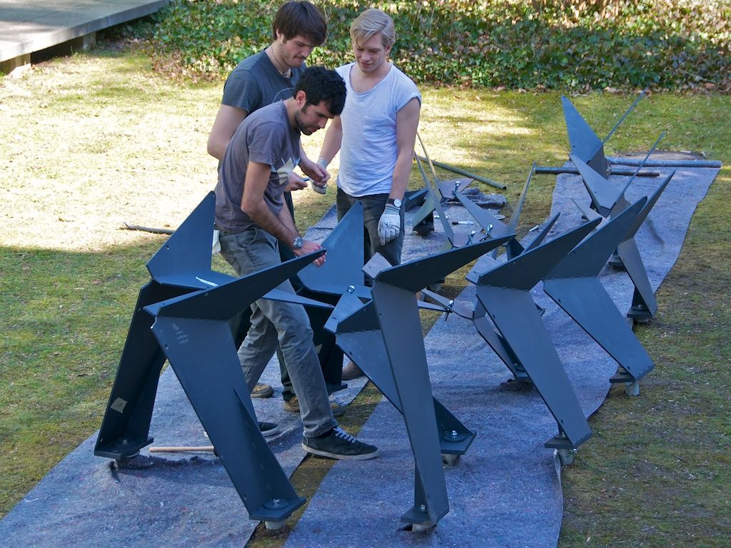 The curvy shape of the installation gives the pavilion the dynamic of a passing flock of birds which streaks the ground only for a glimpse and moves upwards to the sky in its next movement, but the focus is yet on the characteristic features of a swarm of birds.