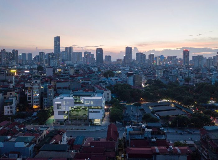 The original courtyard is turned into a multi-functional hall with its new courtyard atop. Given the tropical heat, the Vietnam Institute is consistently adorned with a double skin in all its facades, giving visual hooks and contrasting details of light, shadow, tree, wind, and bird. The idea is to enable a liberal and inspiring environment by being one with nature.