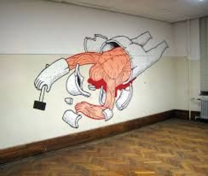 The sense of surrealism that can be noticed in his art makes you pause for a second if you were walking on your legs or slow down your car … Watch… Smile… And carry on with your life. That artist not just draws on the wall but draws a smile on your face. Entertaining Creativity!