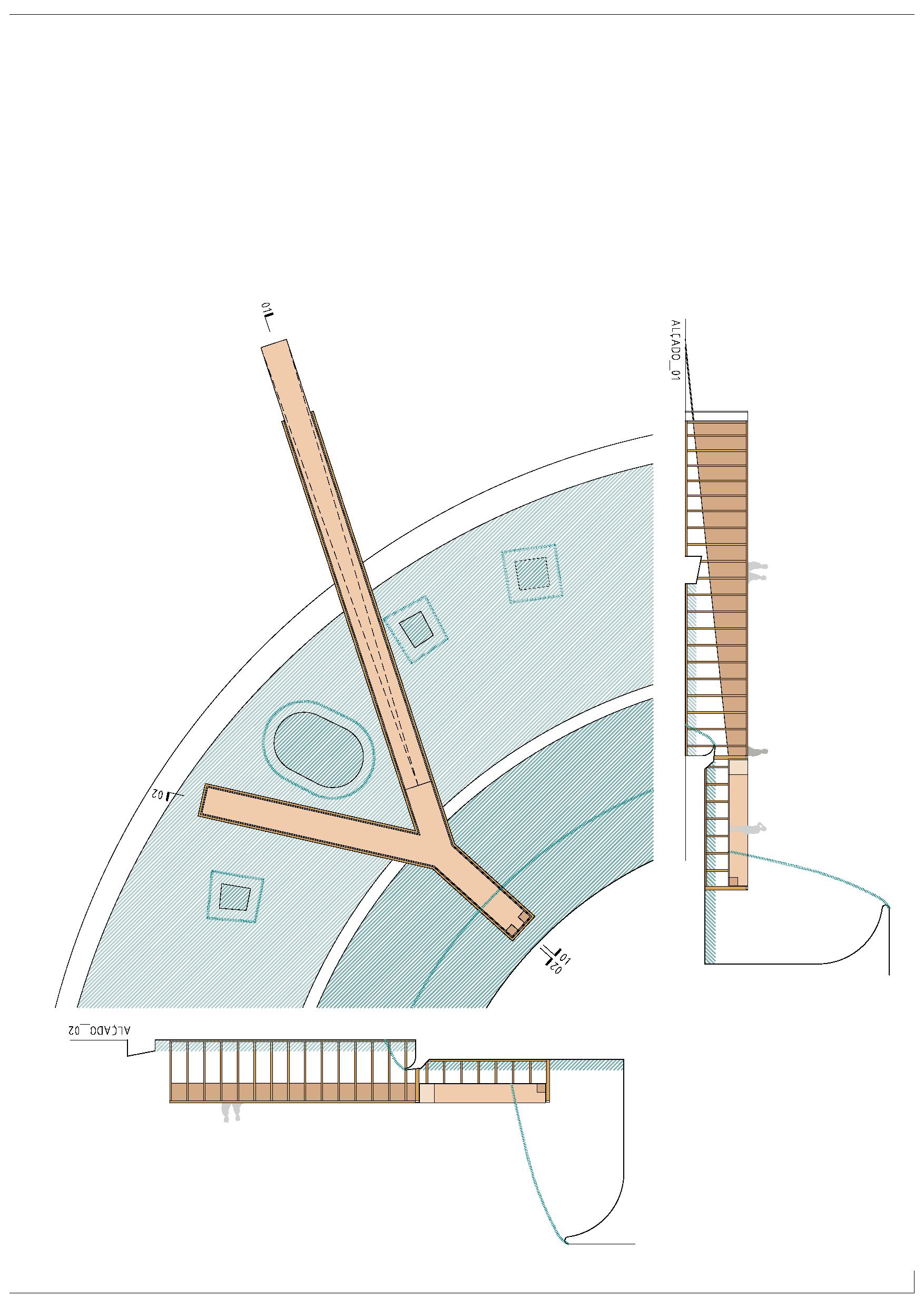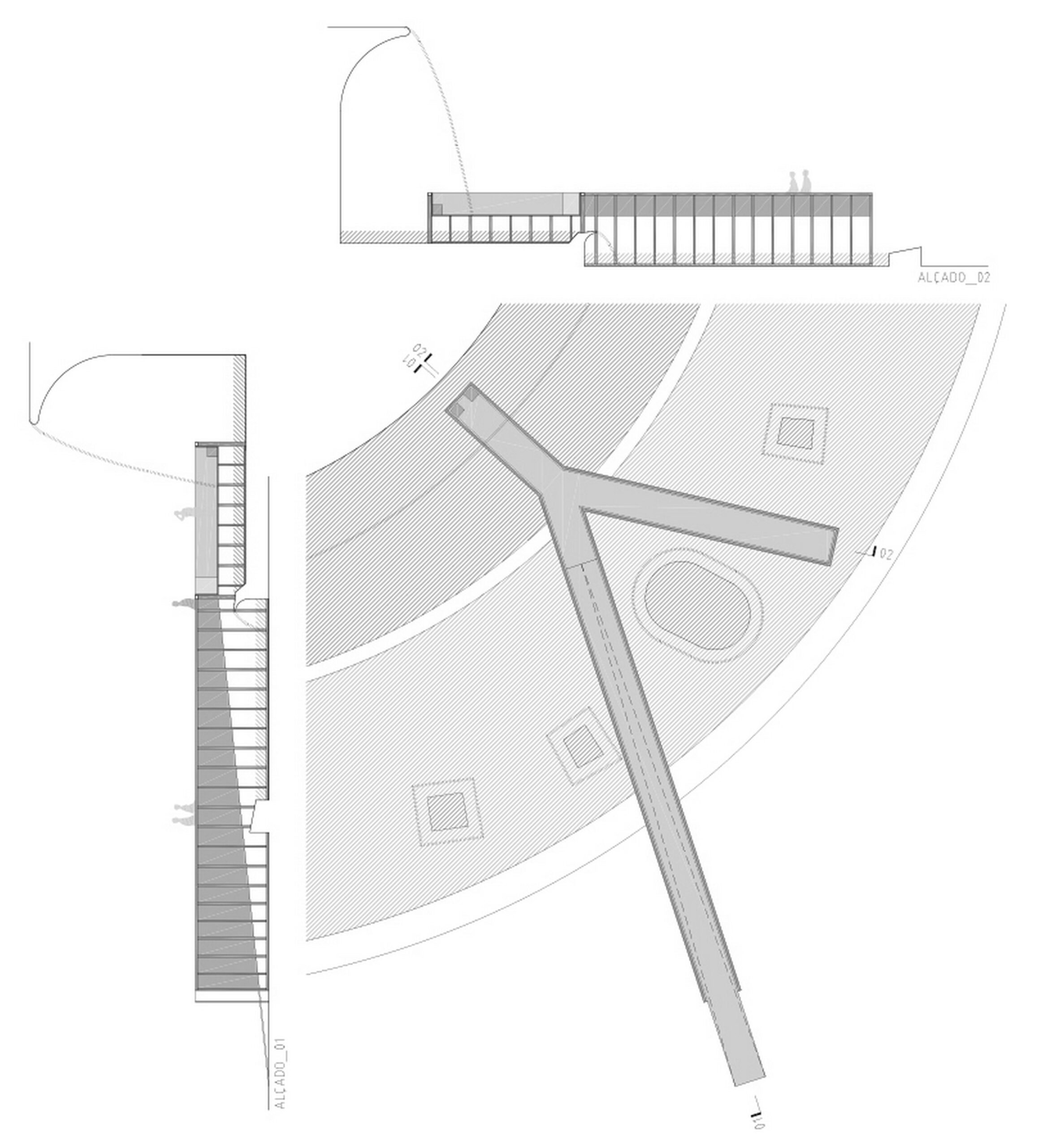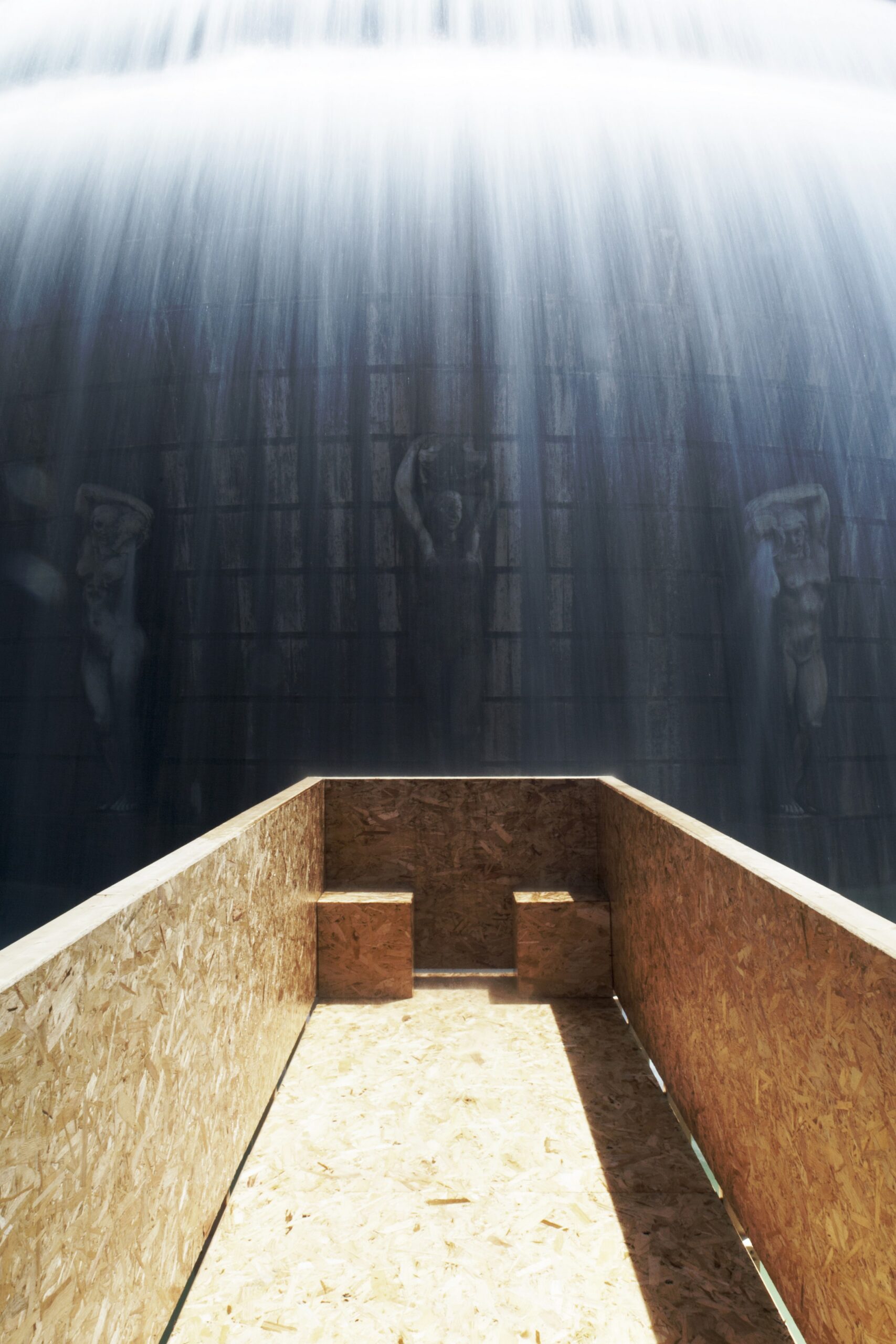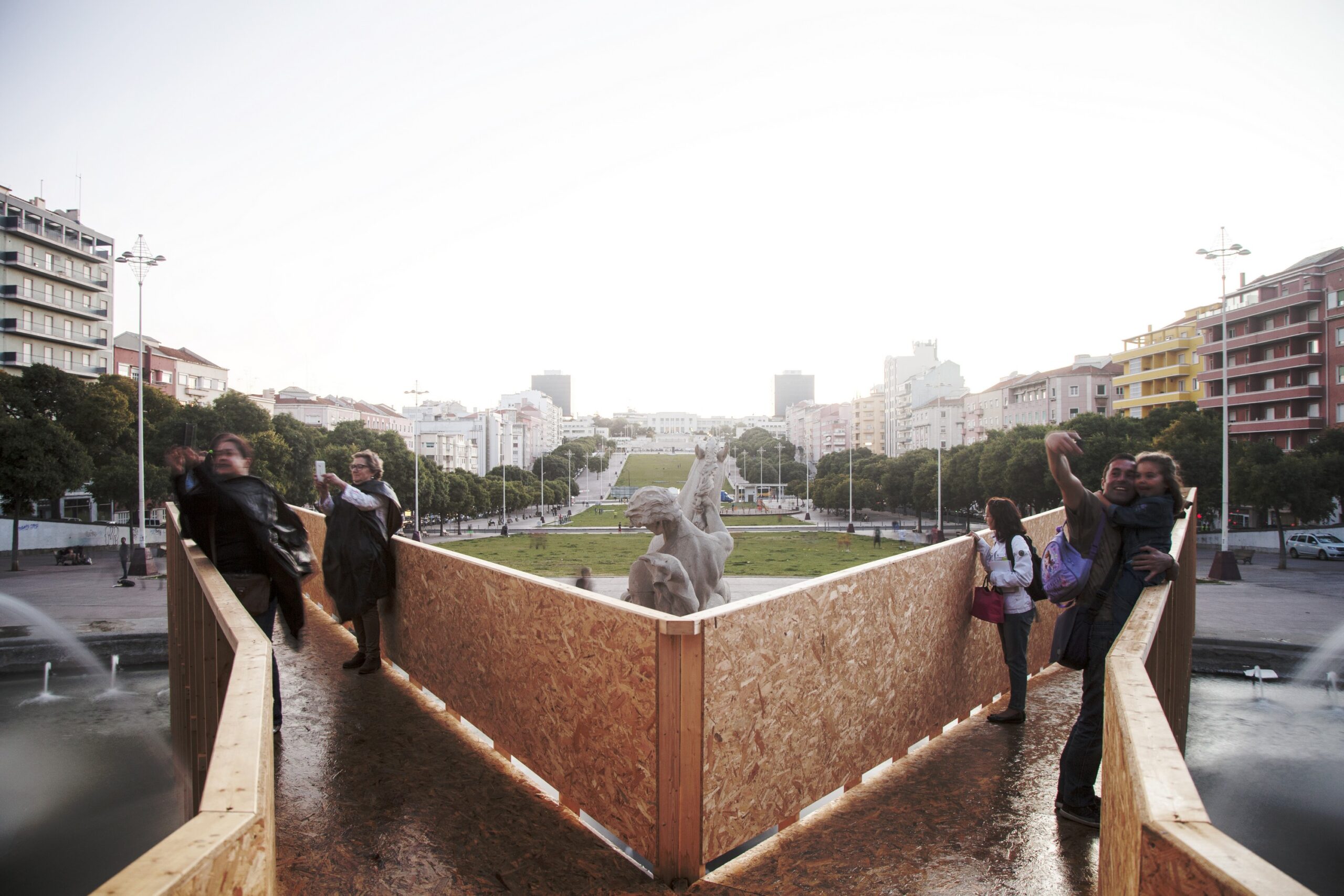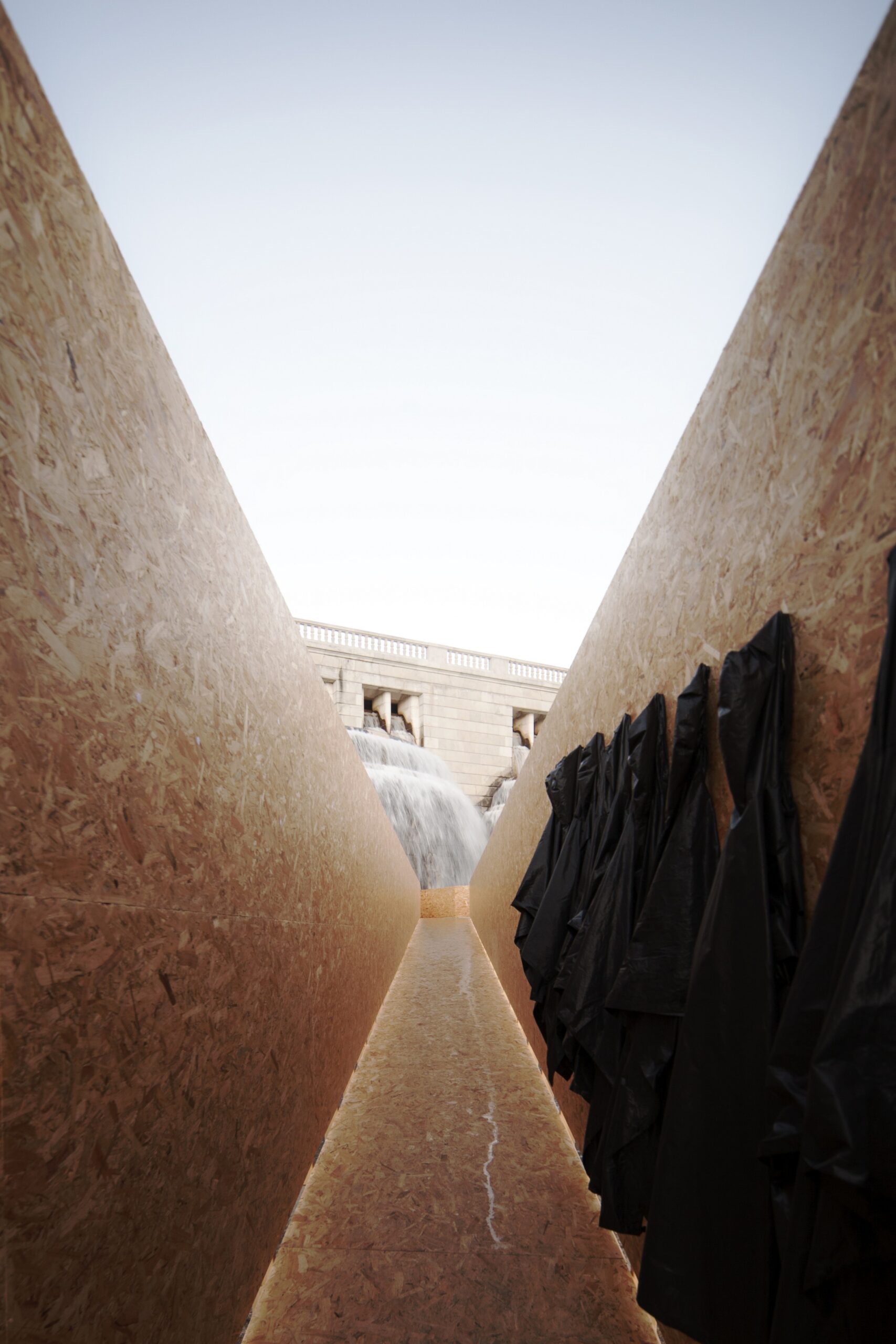 The idea of this temporary installation is to transcend from realism into a completely different dimension, where the visitors are given the benefit of the experience, to re-live them by making memories. This quintessential installation, a wooden batting clad in oriented strand board, skirts around Diogo de Macedo’s Tagus, gradually rising from the plaza to the fountain cascaded by high walls gradually shedding height as one goes up to the unknown, opening into scenic panorama. This splits into two branches, one moving further into the fountain and the other branching onto the other side of the Tagus as a platform overlooking the plaza. The visitors can either chose to get soaked by the fountain’s mist or can wear the cape that’s provided at the opening of the installation.