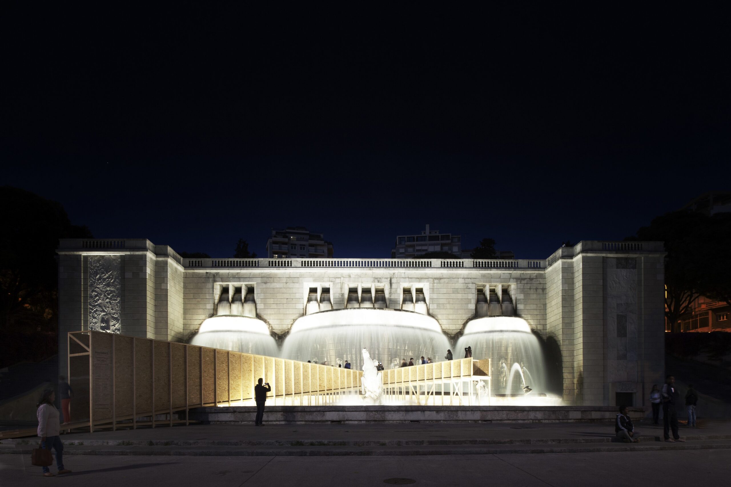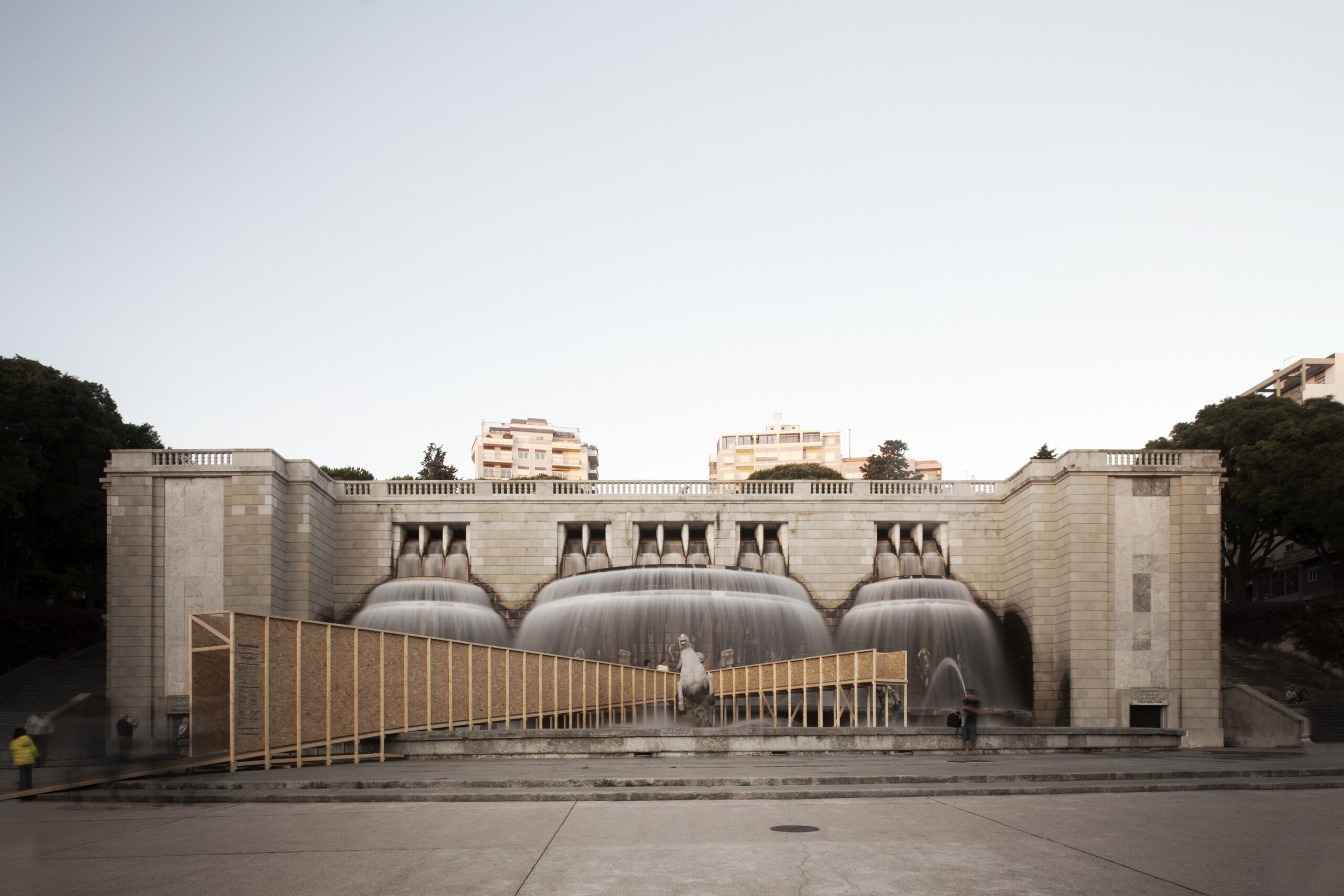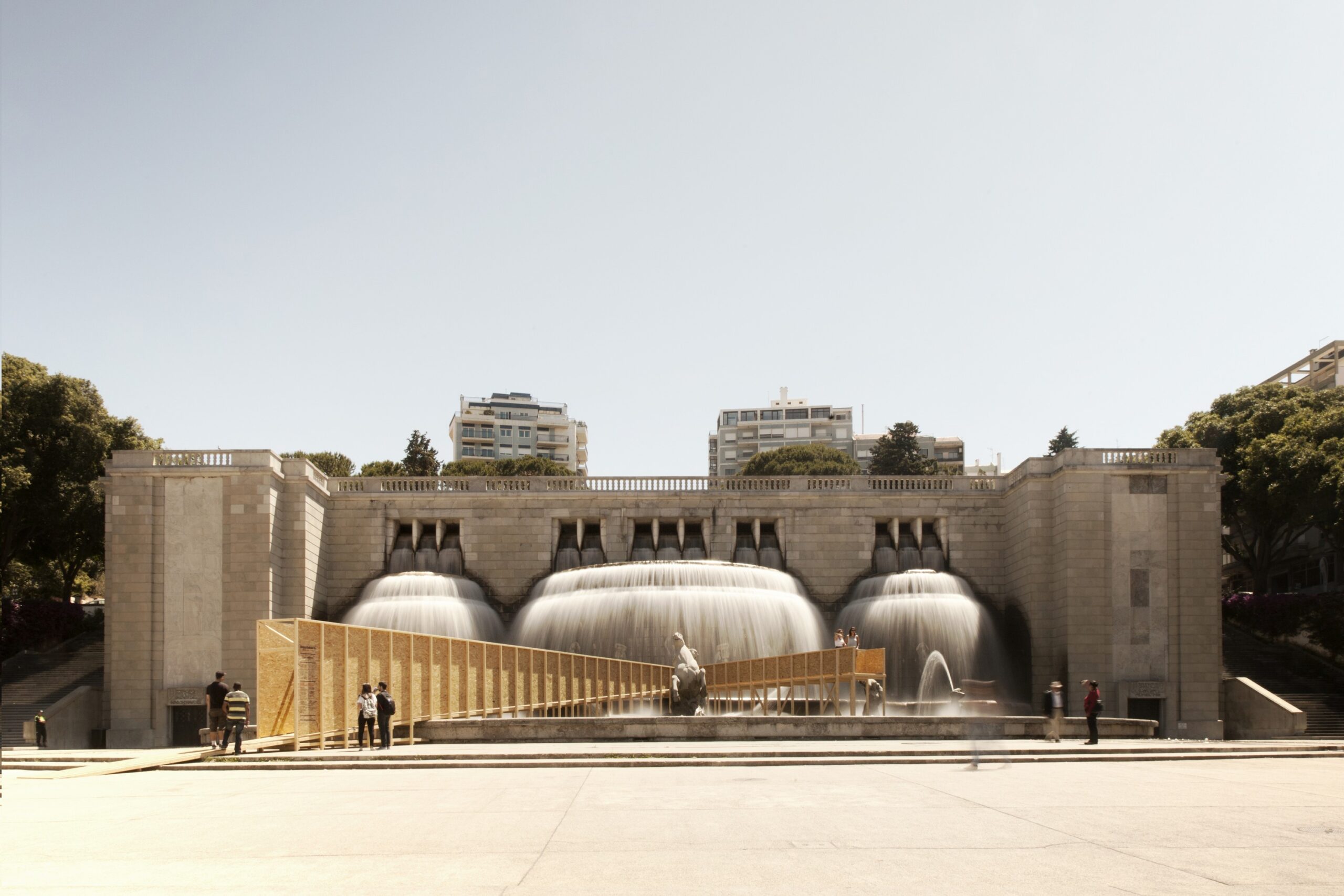 The Fonté Luminosa, a celebration to commemorate for the continuous supply of water to the eastern part of Lisbon, a pet project envisioned by two brothers Carlos Rebello de Andrade and William Rebello de Andrade which was inaugurated on the 30th of May, 1948. Marcello Dantas a Contemporary architect from Portugal, defined a transition to this once viewing spectacle, into the much more “Touch and Realize” interactive space by defining a Y type wooden platform reaching out to the fountain from the public plaza atop the Alameda Dom Afonso Henriques park. “The structure is presented as an idea of trespassing or transition to another reality. For the rediscovery of a known place, now experienced in a more complete way, covering all the senses of our body, in an experience that is meant to be total.”– Marcelo Dantas