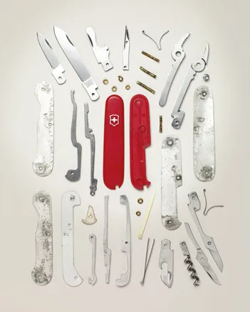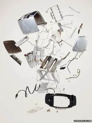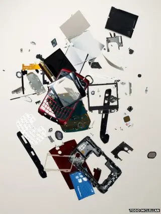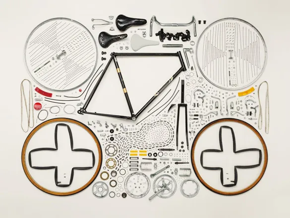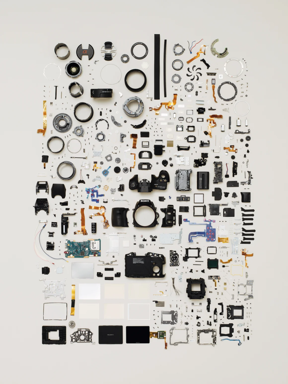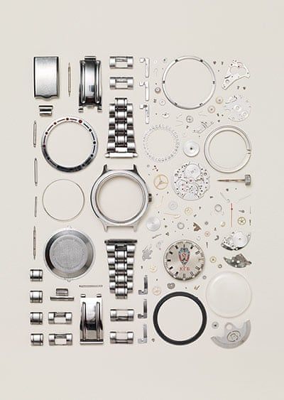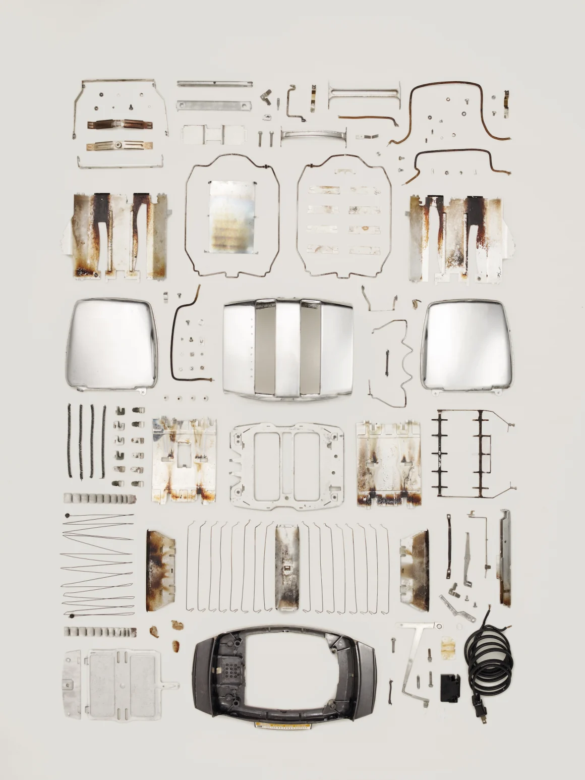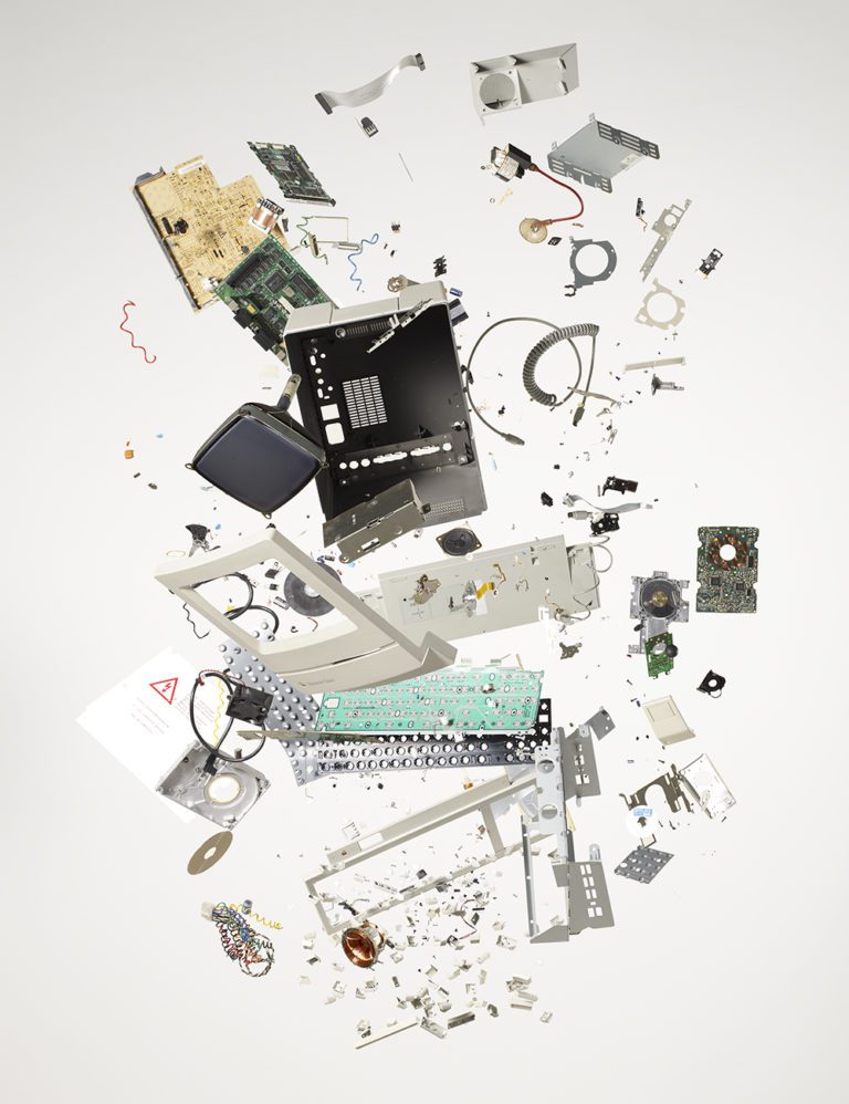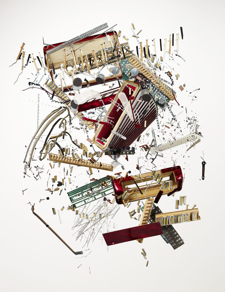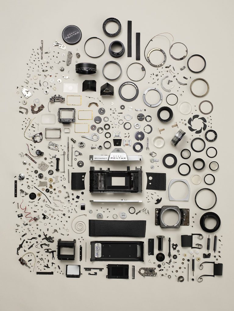 The parts are photographed in a striking way – sometimes organized by function and sometimes exploded in midair as they come crashing down.