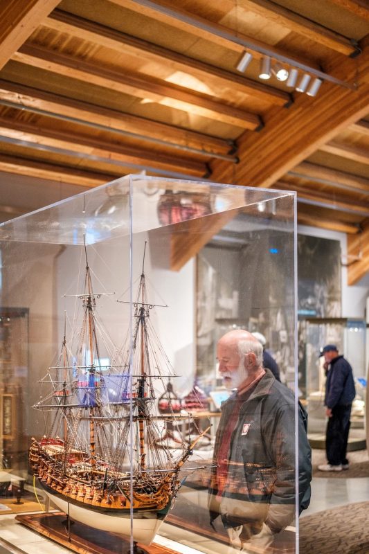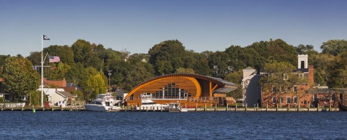 In addition to a 5,000-square- foot exhibition gallery with a high ceiling for displaying boats, the building features visitor reception and events space, a retail shop, a café and outdoor terraces overlooking the Mystic River. Energy-efficient components and geothermal heating and cooling are also incorporated in the design.