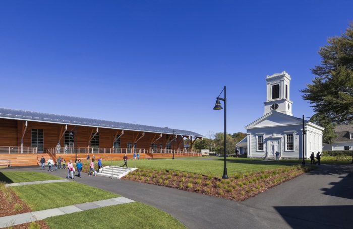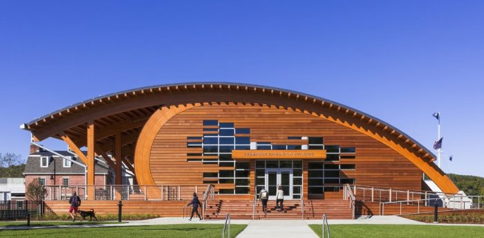 The structure’s asymmetrically curving roof and end walls recall nautical themes while also establishing a contemporary architectural presence amid a recreated 19th century maritime village. Site development also opens views of the Mystic River from Greenmanville Avenue.