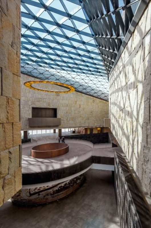 Three individual blocks of the new Museum, forming an experiential construction of time and space. The central courtyard enclosed by three blocks symbolized the harmony, vitality, as well as the unity. In addition, by reference to the Chinese dragon cultural pattern, the three separated blocks in the central location of atrium space is connected by three bridges, which implying the process of Chinese civilization from secession towards solidarity. The lower ground floor of the central courtyard is simulating the ancient period of the three ancestors, regarding the settings, such as the stone carving on the wall and sculptures interior, in order to render the historical atmosphere, further building up the cultural palace of the three ancestors. The whole architectural model, including the three individual blocks and the central courtyard, is echoing the herring-boned building pattern in the three-ancestor period, so as the semi-subterranean dwellings.