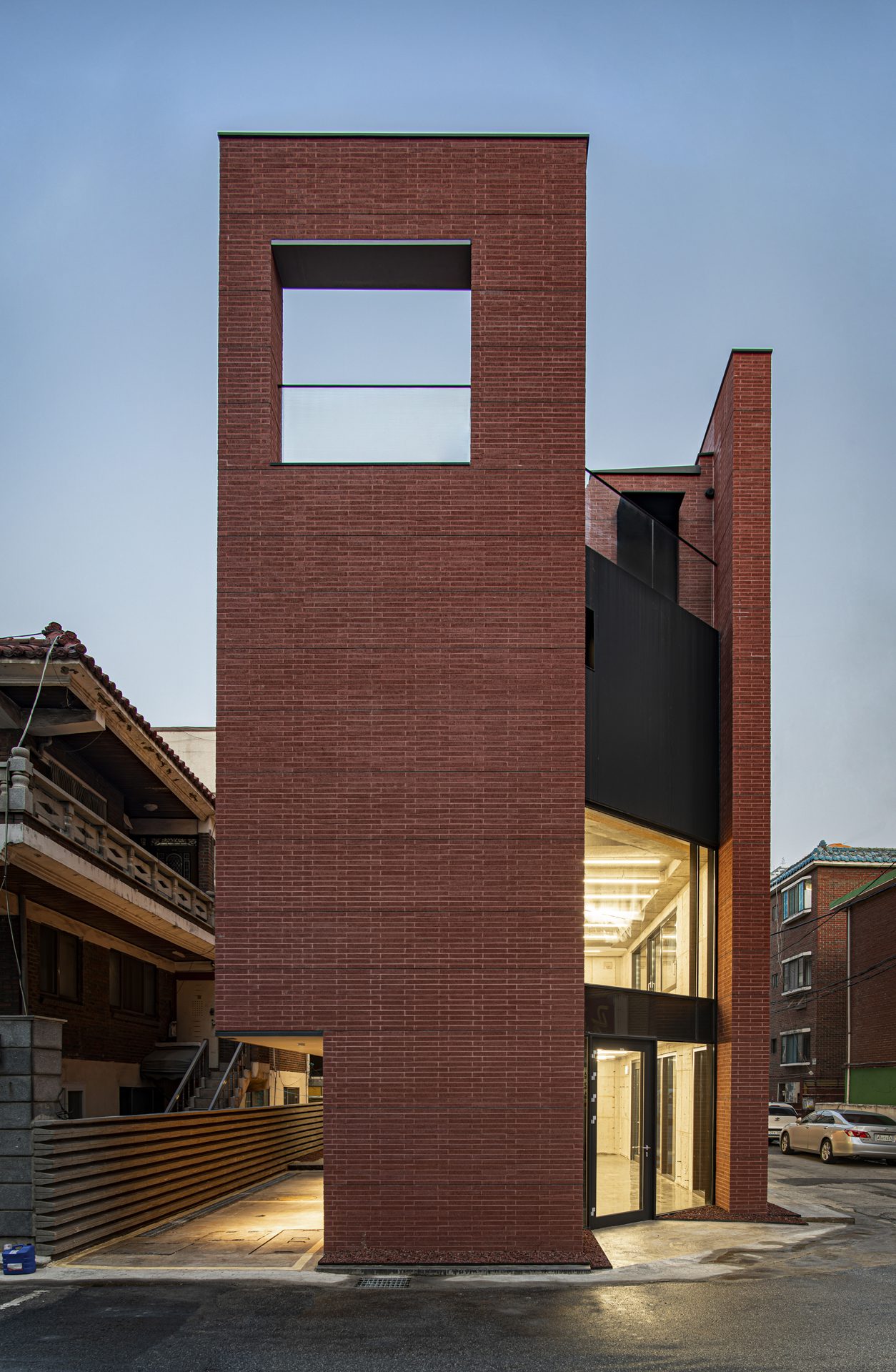 Three Planes Five Layers Apartment Building, Small buildings in Korea are often shaped by building codes and regulations. As the property was cut off with corners of 18m X 8.4m, the size and shape of the building were determined under the highest priority of ensuring maximum floor area ratio (FAR) and maximum building coverage ratio (BCR). According to the building regulations, three-story building can be built on this property, but surrounded buildings were five-story buildings which were built back in 70’s and 90’s. If a small three-story building sits here based on building regulations, an independent building will be created which ignores the entire context of the city.