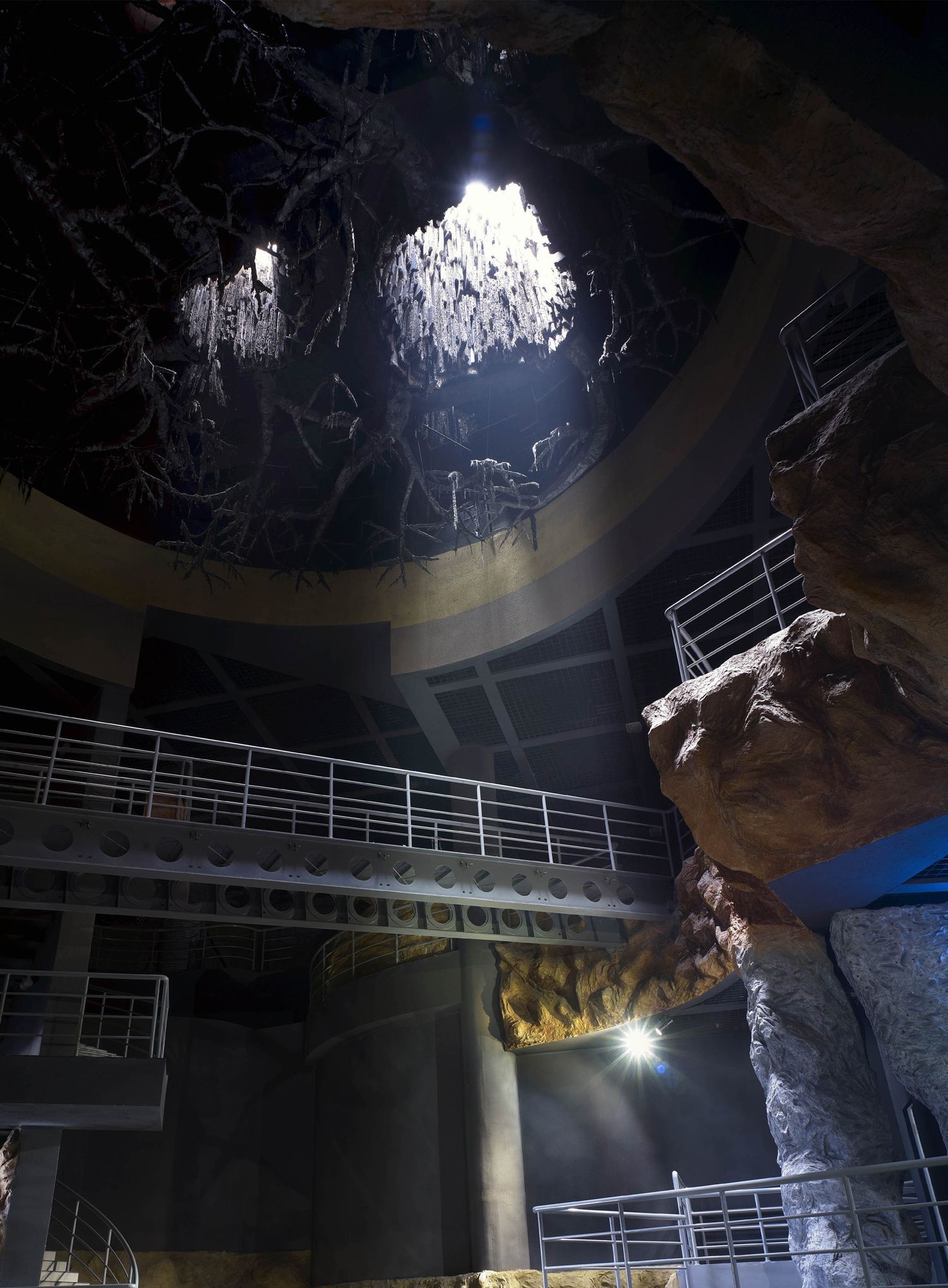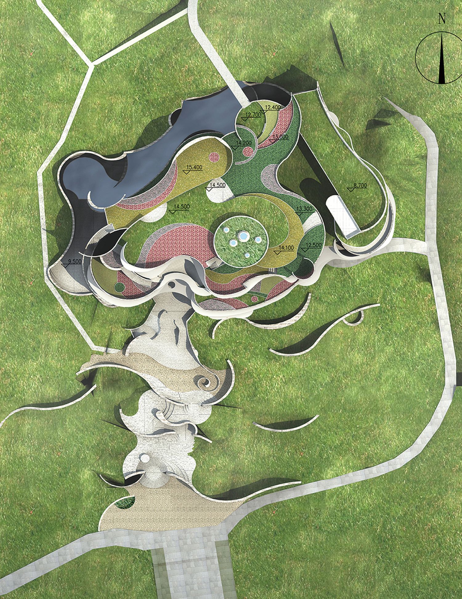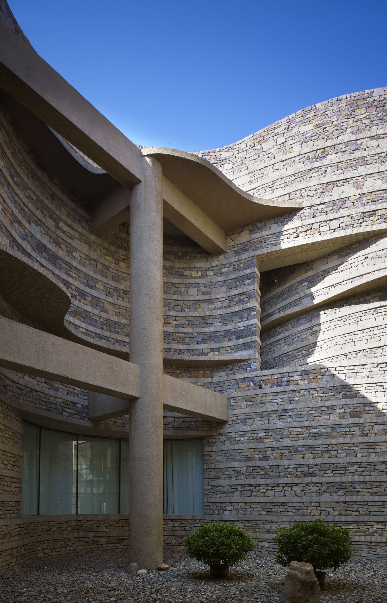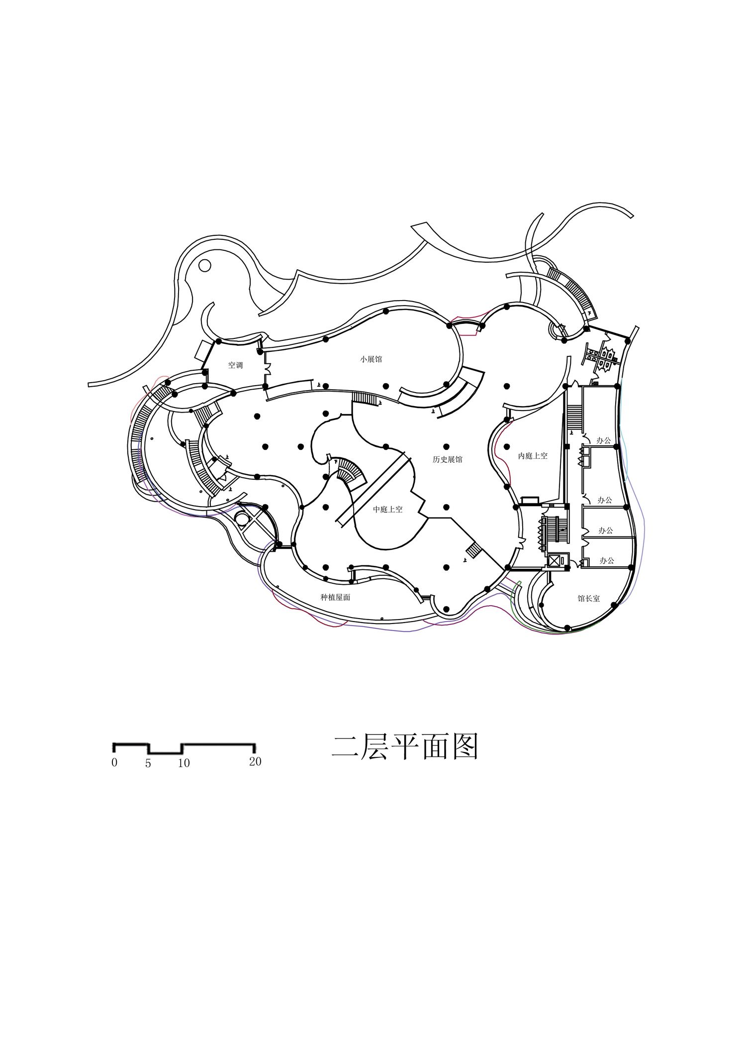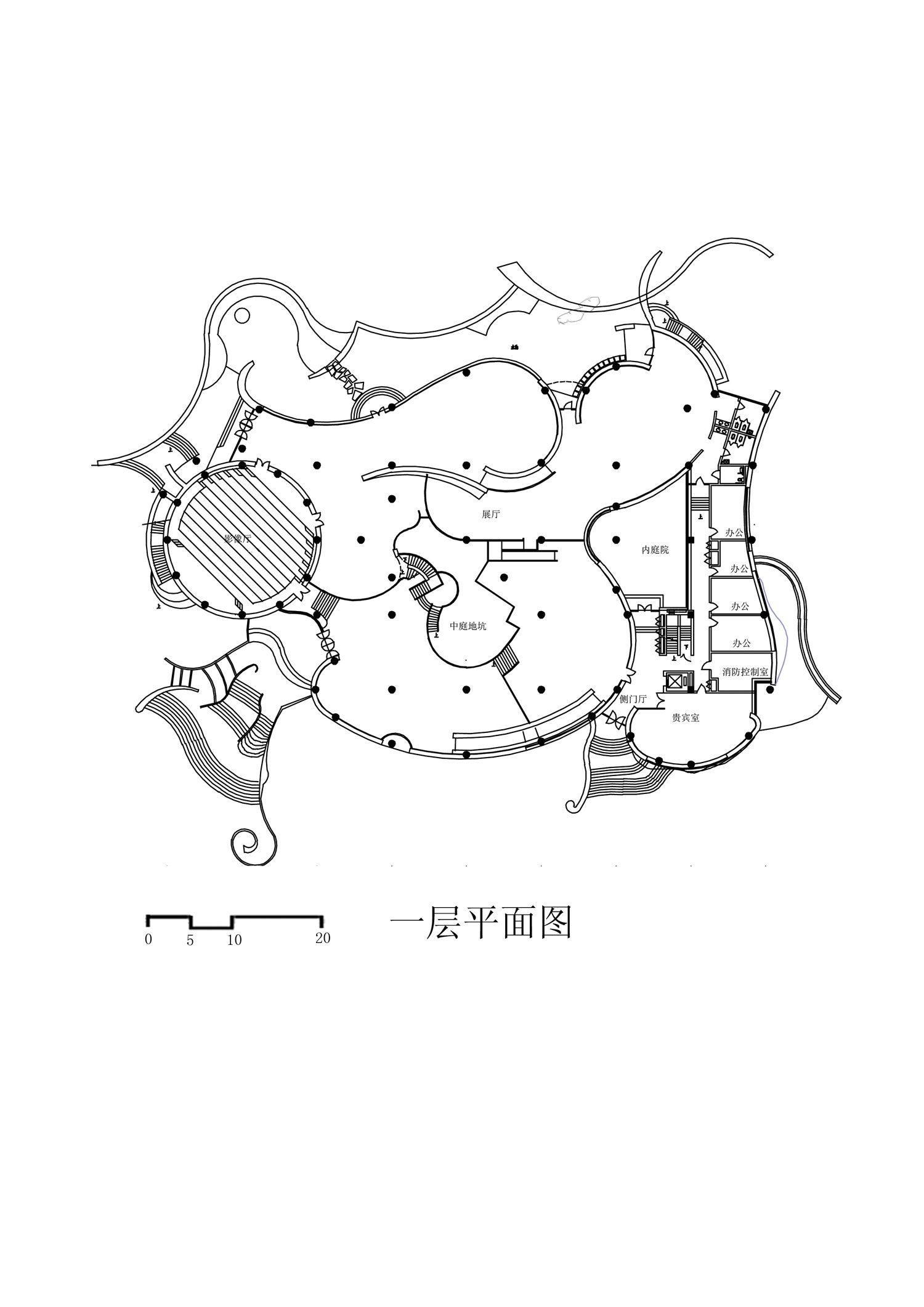 The Ji County Geological Museum has taken “the exhibition of the history of tier and fold of rocks” as its theme, using stones of rare shapes which have evolved over billions of years to construct the outline and space of the museum. The museum imitates the special forms of geological structure, forming a spiral plane layout. The irregular curving eaves and the newly built wall made of the stones from the discarded mountain houses look just like laminating stratum formed after billions of years’ sedimentation.