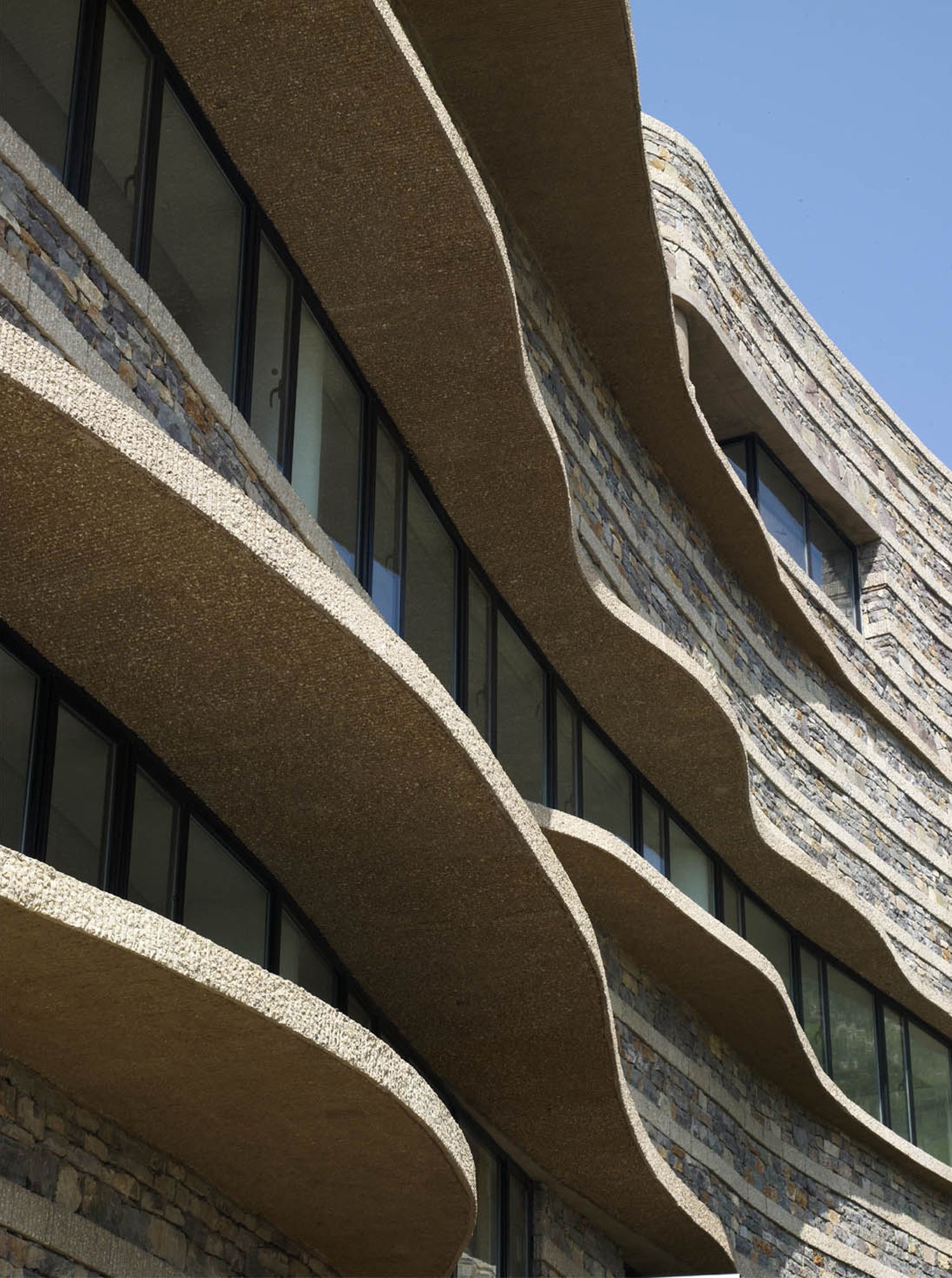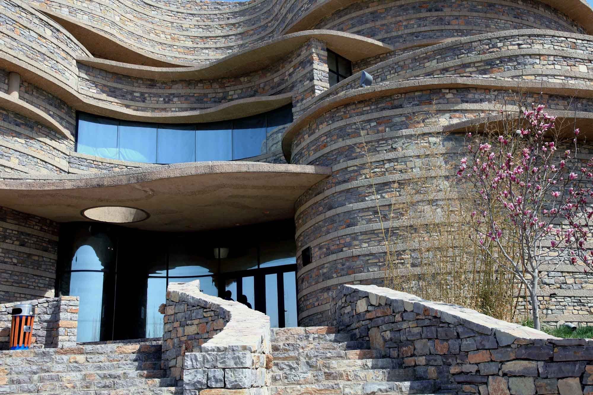 The irregular curving eaves and the newly built wall made of the stones from the discarded mountain houses look just like laminating stratum formed after billions of years’ sedimentation. The architecture looks so natural as if it is grown from the underground layer after layer, showcasing the unique charm which can only be seen after great changes.