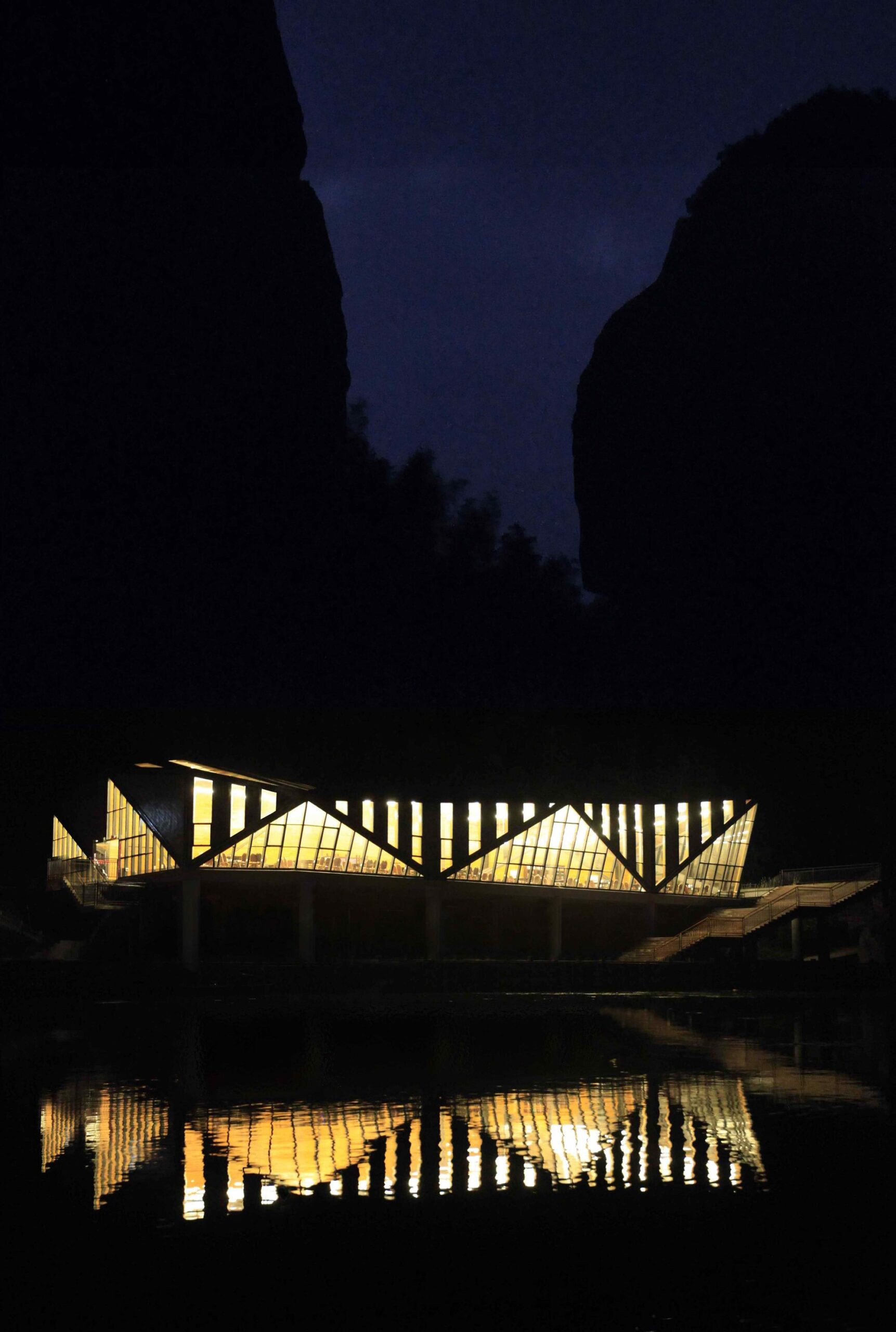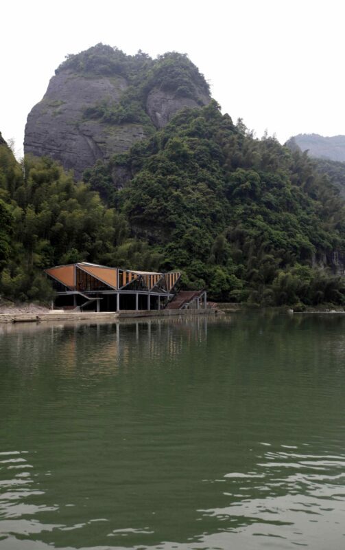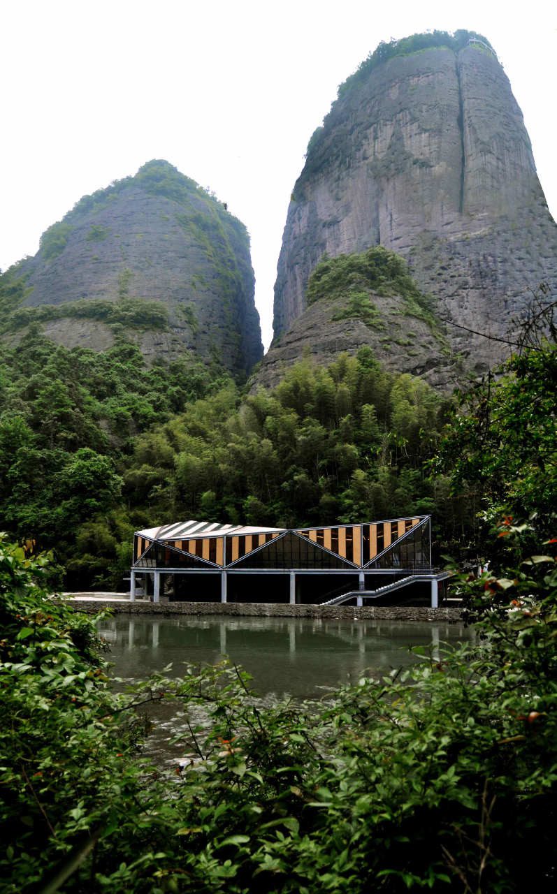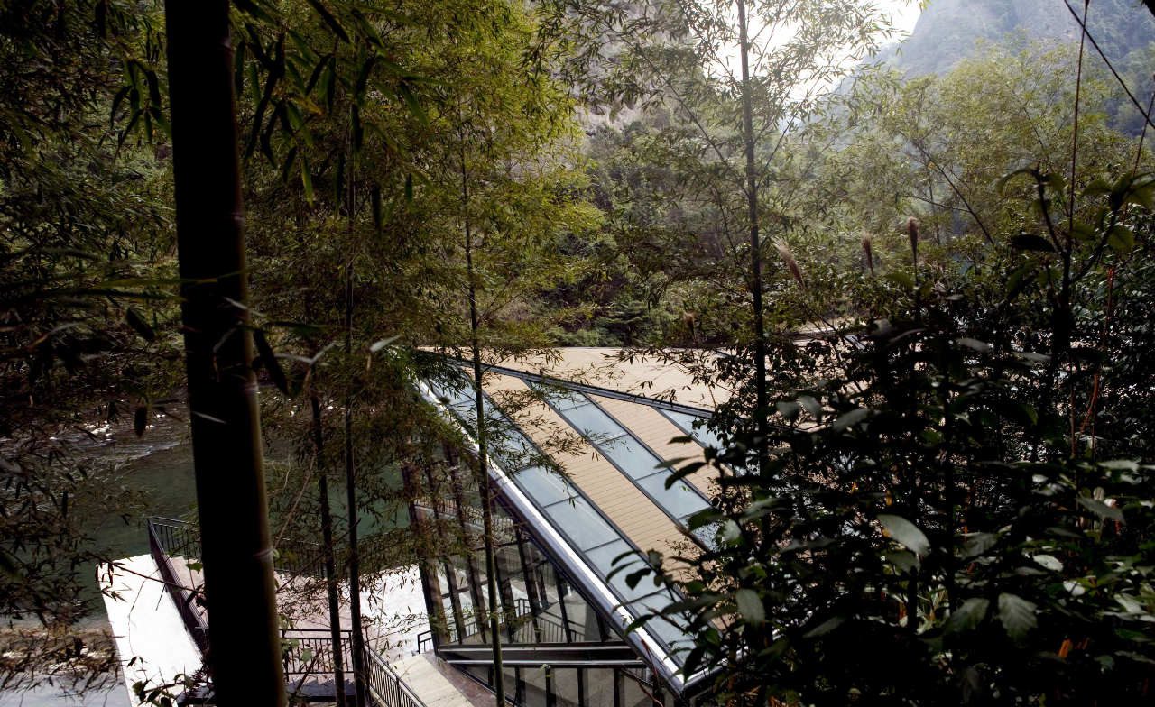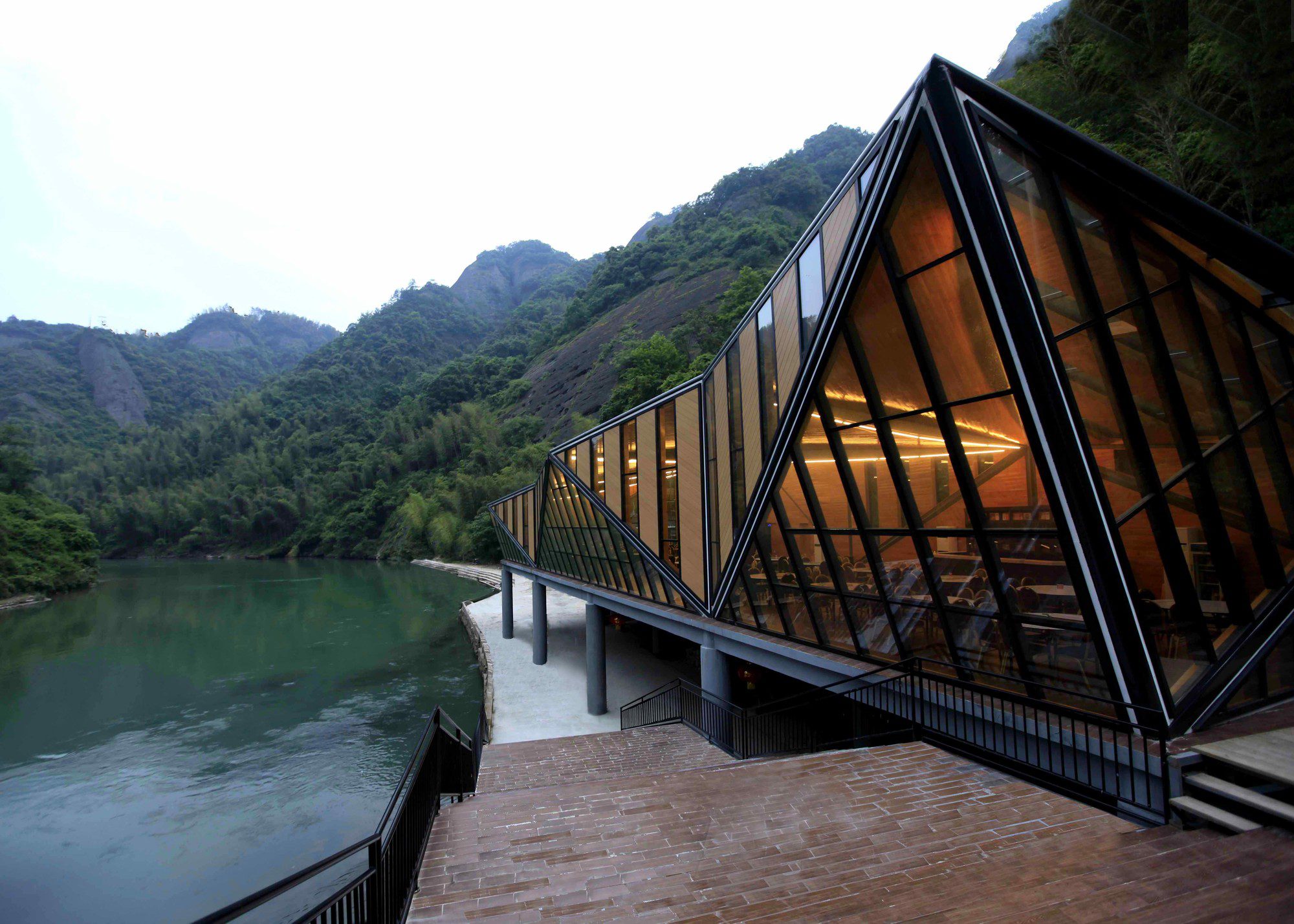 Tianmen Mountain Restaurant is designed by Liu Chongxiao, and located on riverside opposite the Peach Blossom island, this triangulated glass and steel restaurant located in a fantastic sight point in Tianmen Mountain scenic of Guilin in southern China.  The Tianmen Mountain Restaurant is constructed from triangular panels of alternating timber and glass strips that allows diners a view of the surrounding landscape, the restaurant was oriented not just as a building but a special viewfinder for its visitors.