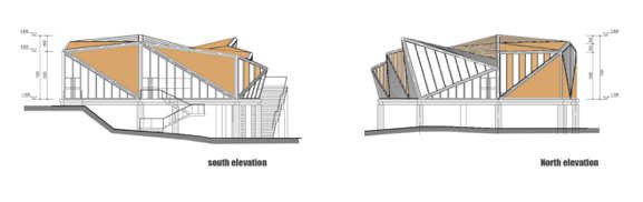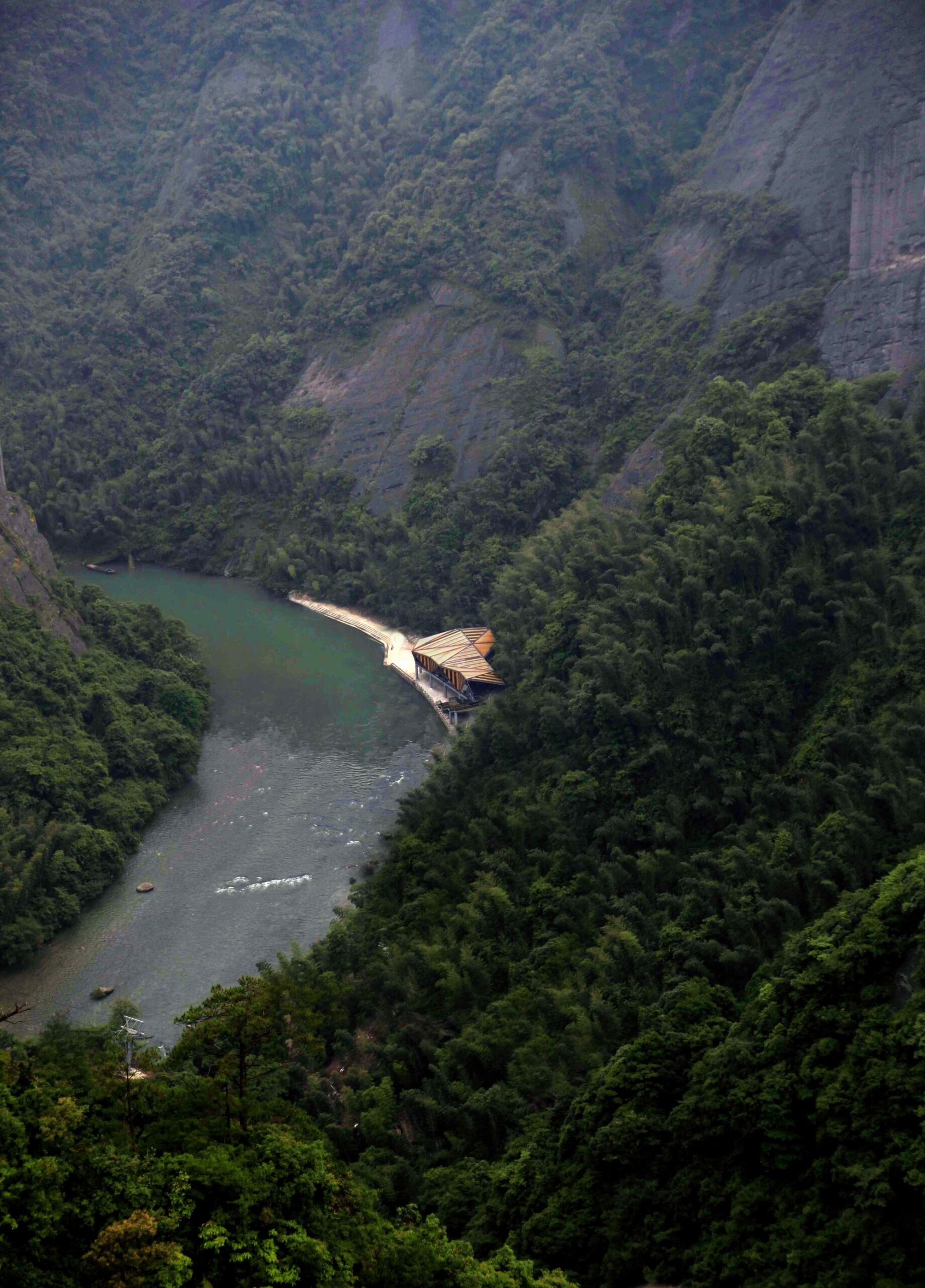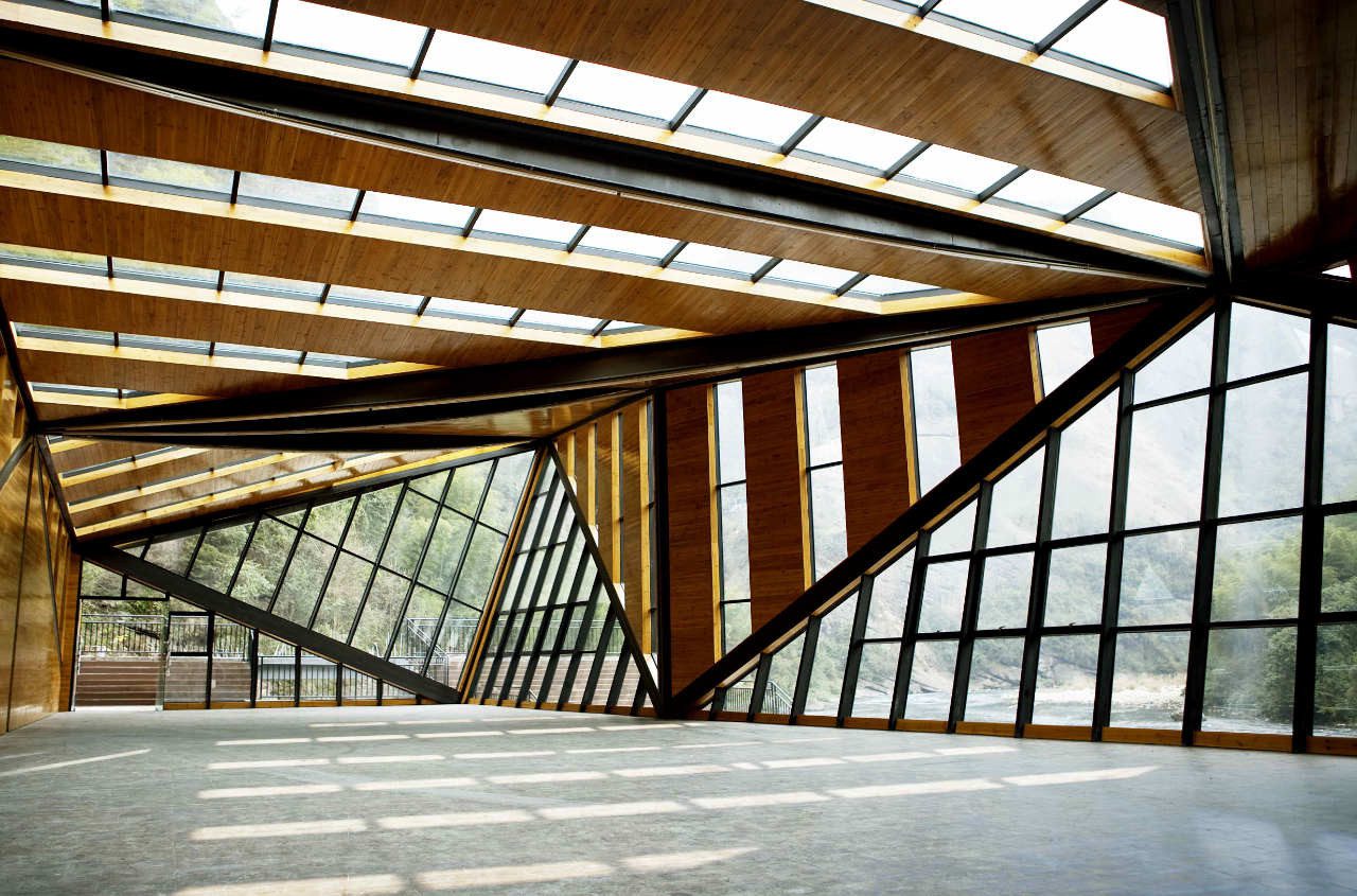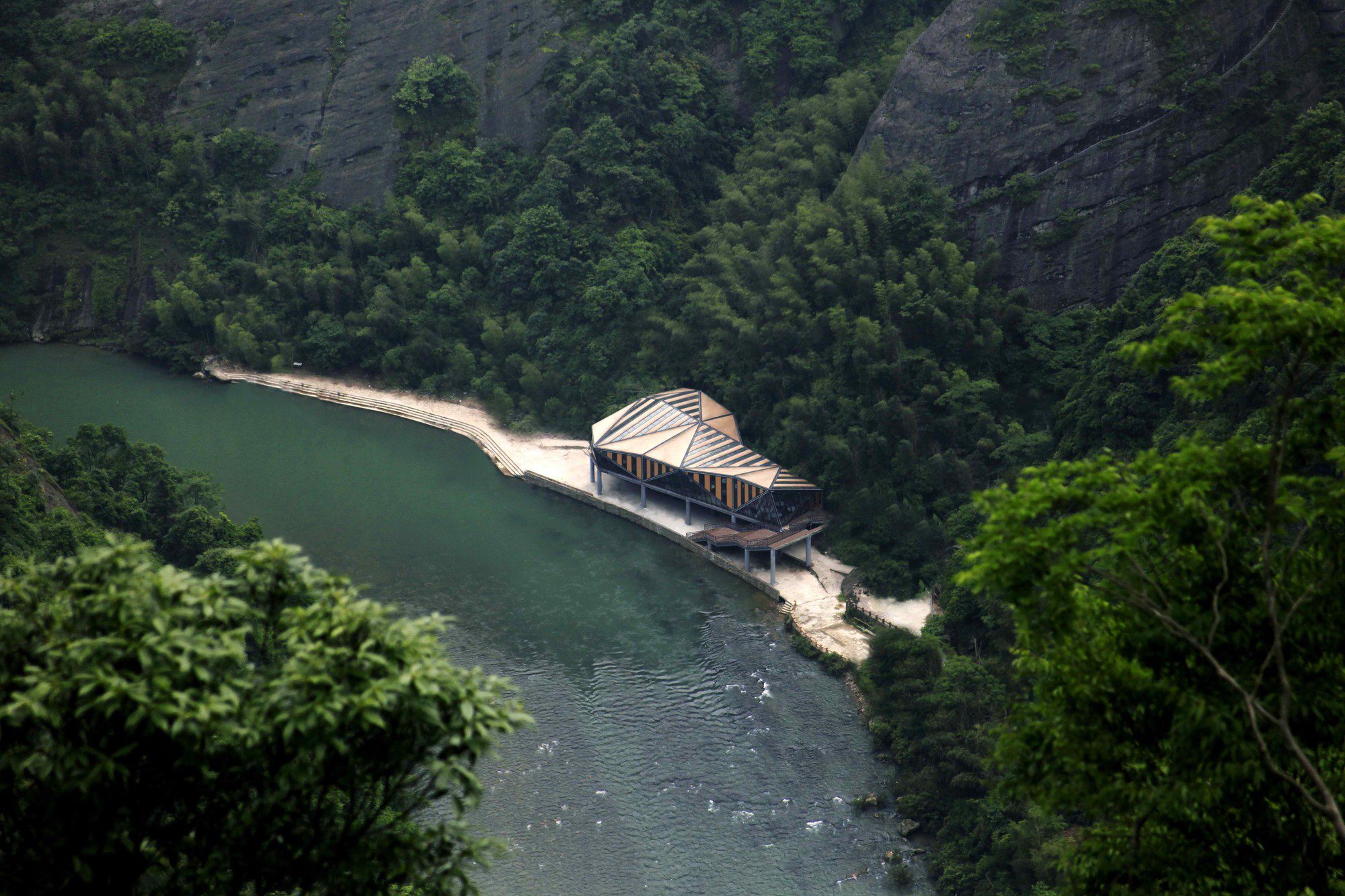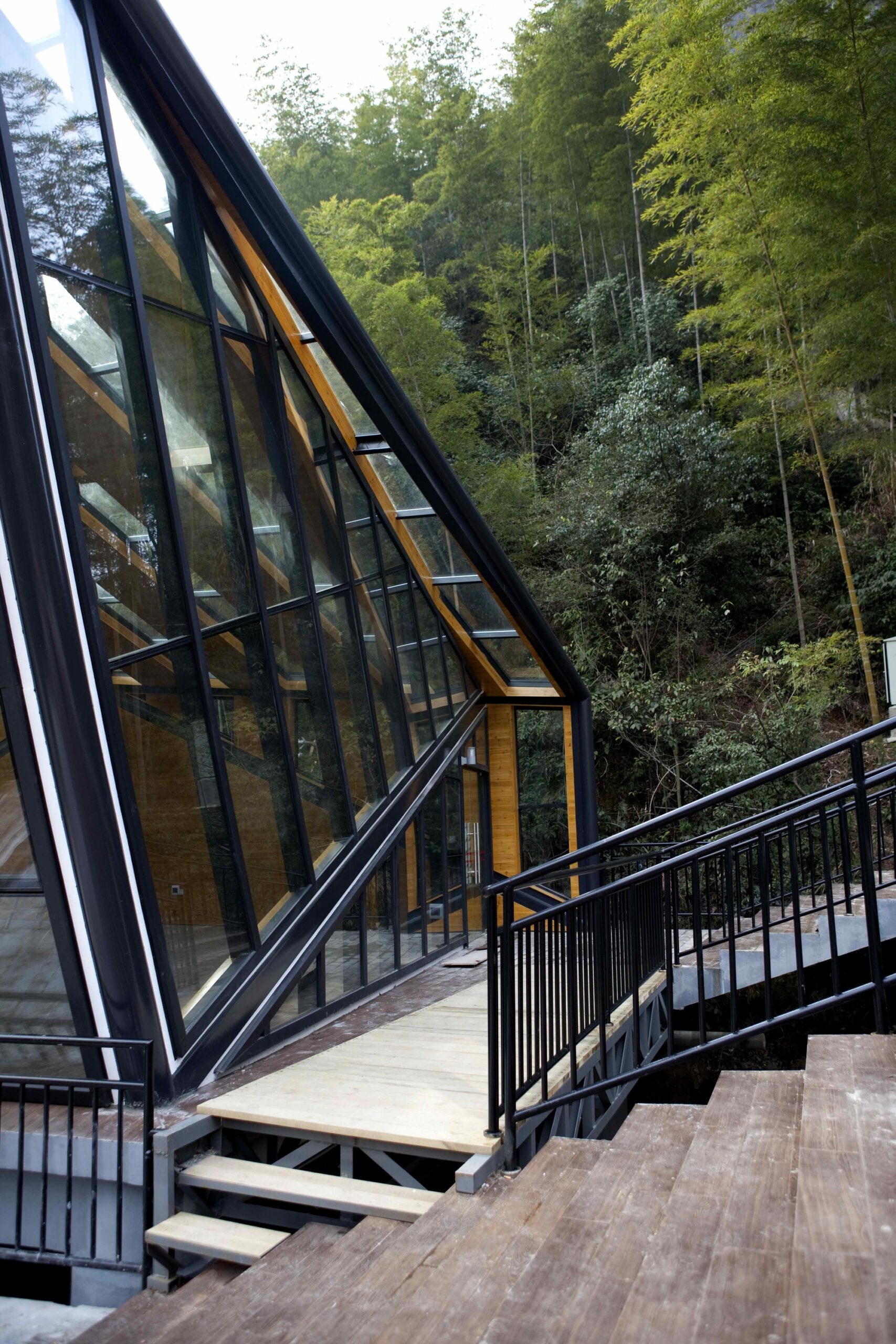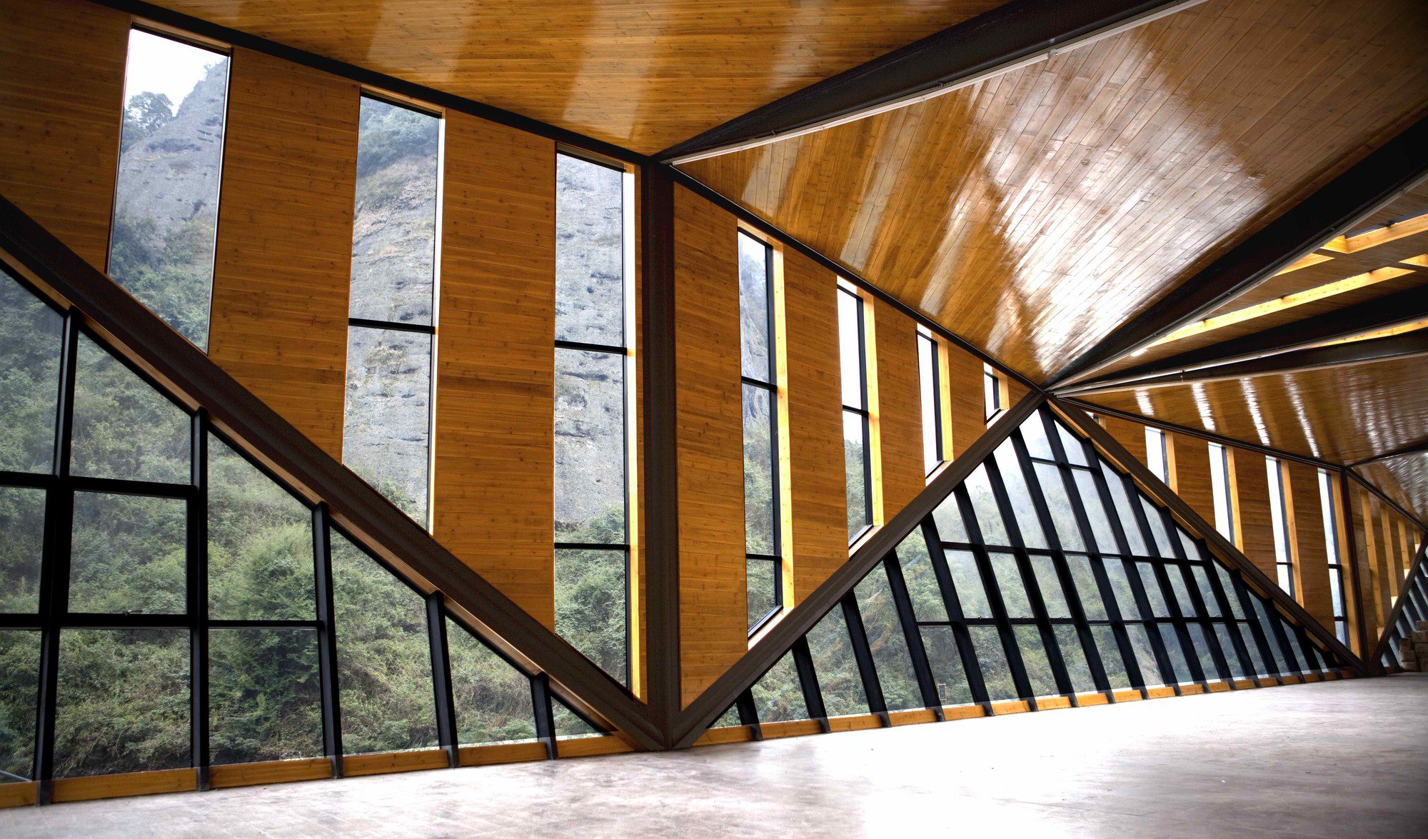 Tianmen Mountain Restaurant is designed by Liu Chongxiao, and located on riverside opposite the Peach Blossom island, this triangulated glass and steel restaurant located in a fantastic sight point in Tianmen Mountain scenic of Guilin in southern China.  The Tianmen Mountain Restaurant is constructed from triangular panels of alternating timber and glass strips that allows diners a view of the surrounding landscape, the restaurant was oriented not just as a building but a special viewfinder for its visitors.