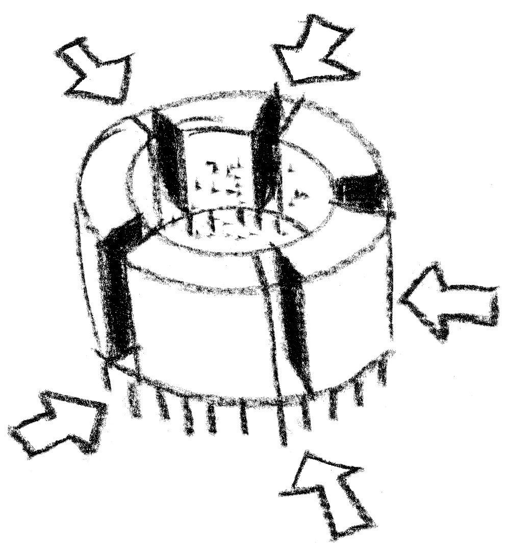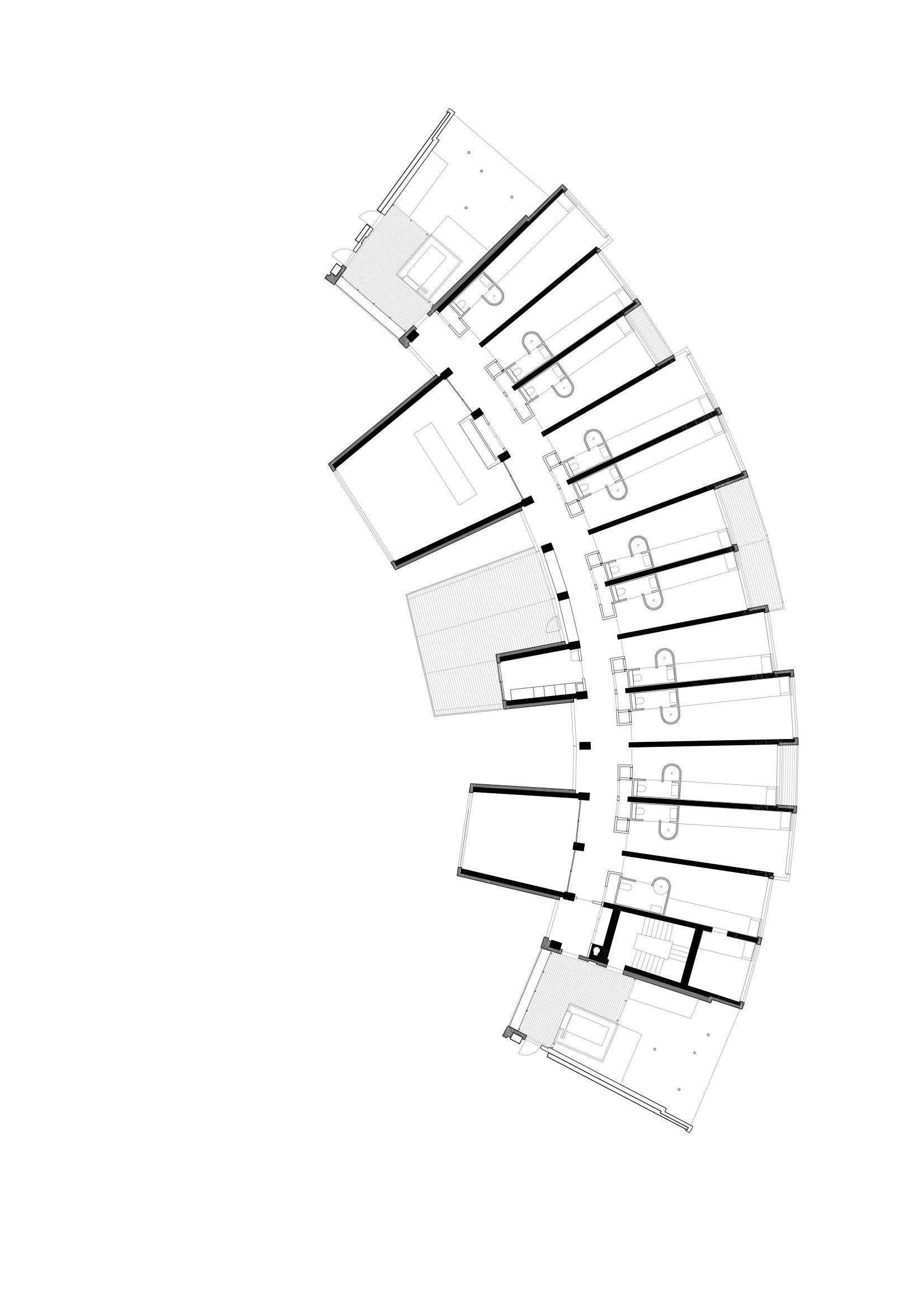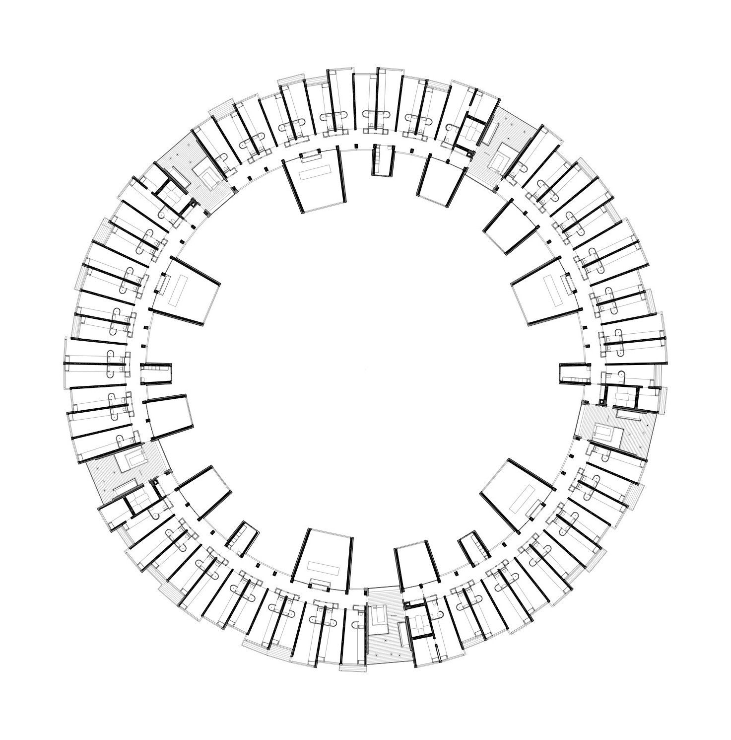 The cylindrical volume completes itself and orients itself around the inner courtyard. The upper levels are organized with residences along the perimeter with views to the surroundings, while the communal functions are oriented toward the inner courtyard. The communal areas find expression as dramatic, projecting forms pointing inward to the courtyard.