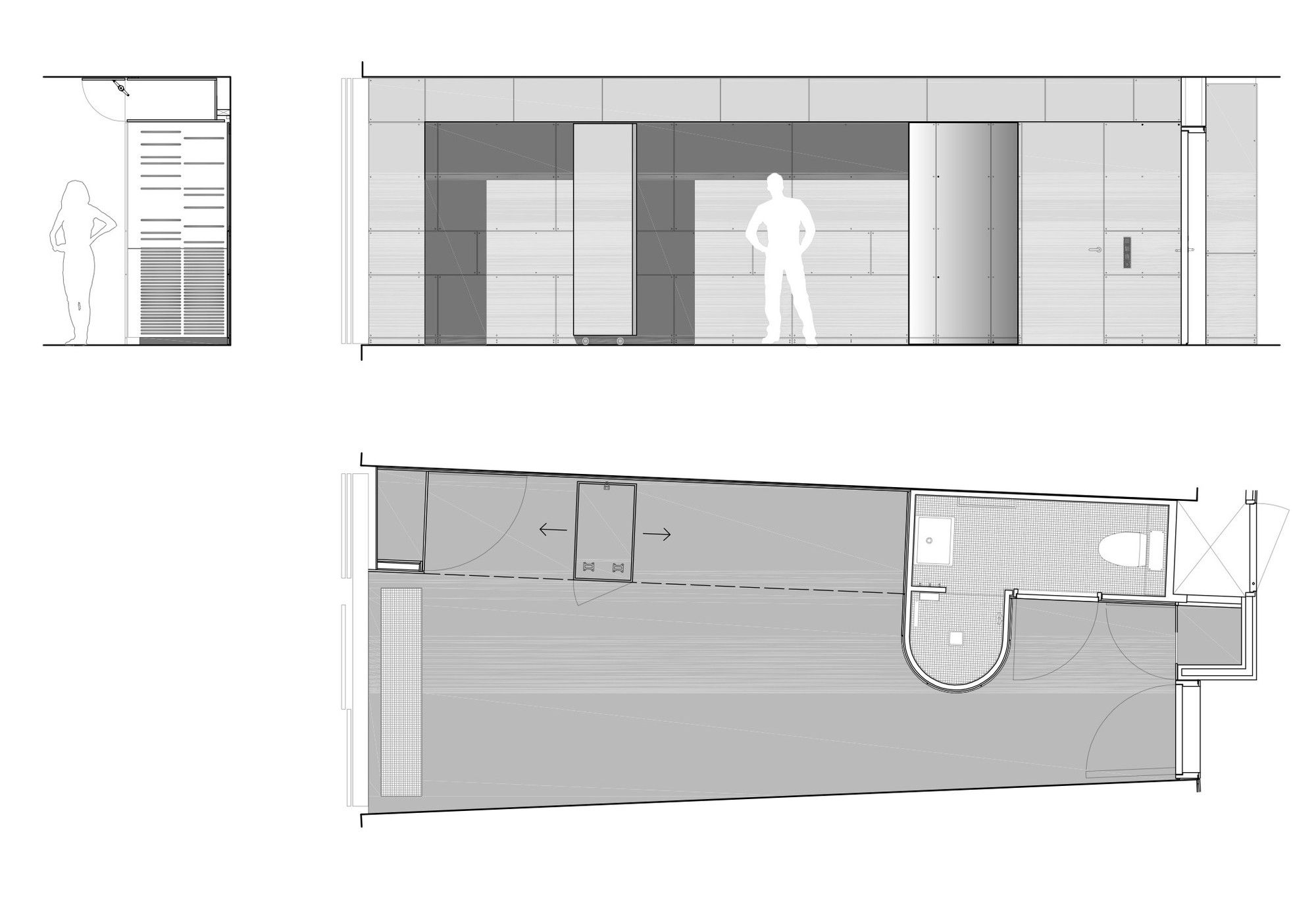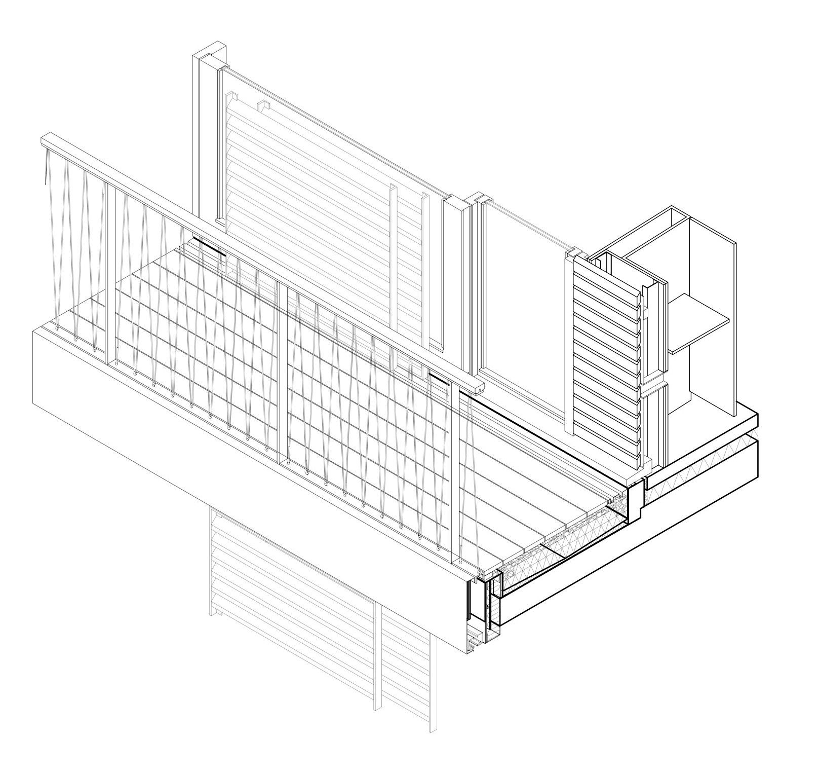 At ground level the courtyard is accessed via open passages, which in turn give vertical access to 5 building sections. On each floor, each of the 5 section consists of 12 residences organized around a communal area and kitchen. Facilities common to the entire dormitory are grouped at ground level.