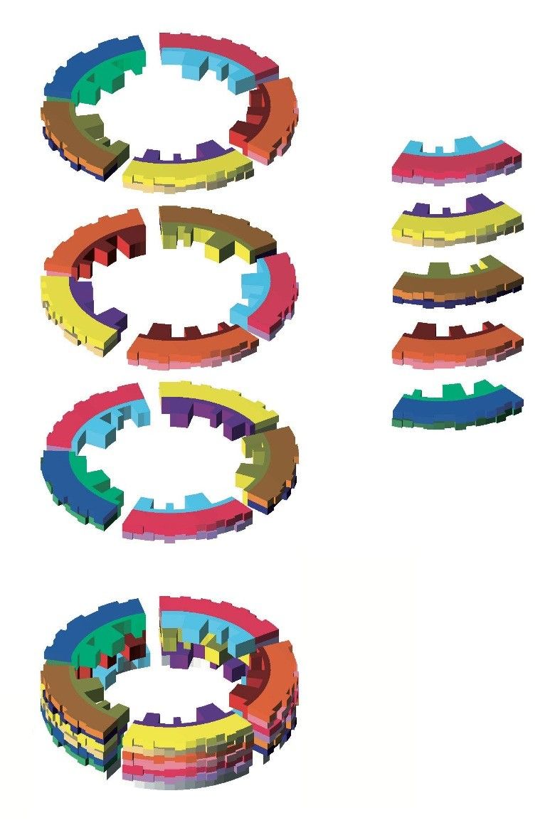 The residences are of various depths in a changing tact, giving the outer contour its characteristic crystalline expression. The unique identity of each individual residence thus revealed, and the potential urban monumentality of the cylindrical form is neutralized.
