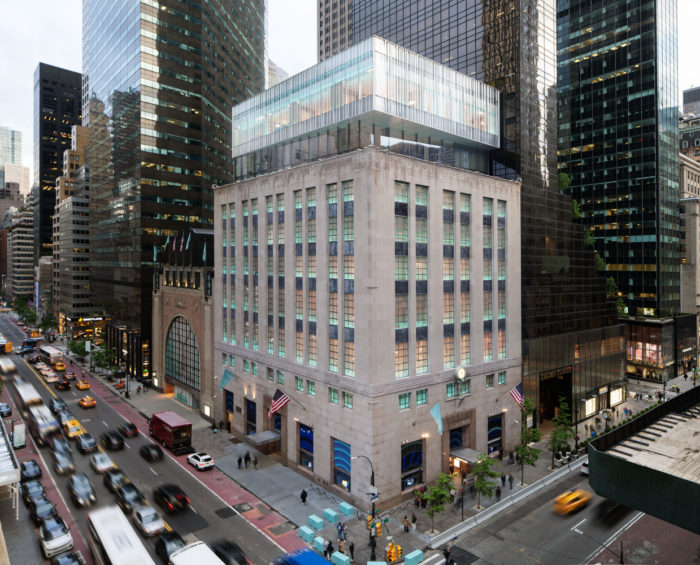 The façade, which resembles a gauzy curtain, responds to the harsh glass structures that tower over the Tiffany Landmark, adding a new textural dimension to the otherwise gloomy appearance of the original limestone structure and the glass box expansion. When lit at night in Tiffany Blue, the new jewelry box floats over the historic building, symbolizing the revitalization of the flagship and the brand.