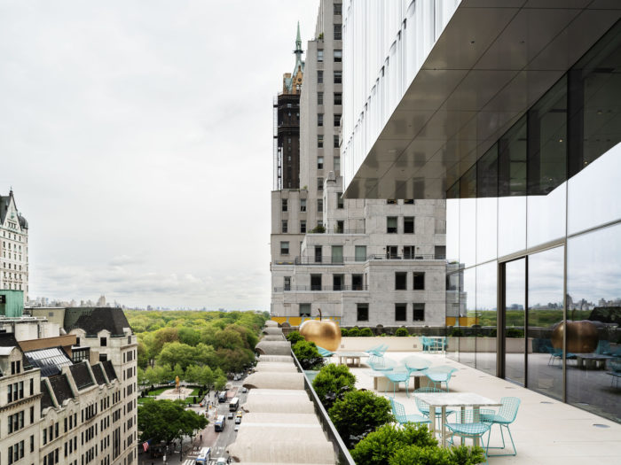 A transparent cube with two floors (one for exhibits and one for events) creates a flexible space that may accommodate each program simultaneously or separately. The patio wraps over three sides of the building, looking out over the city and Central Park via the straight, transparent glass façade.