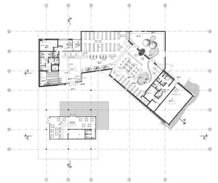 The library’s unique location at the park allows the project to conduct a complex dialogue between the nature and the building on several different layers – first, the building is being conceived as a gate entrance to the municipal garden, visitors are passing through the open ground floor directly to the public garden on the other side. The inner part of the building facade (north-east direction) touches the ground and allows the garden to climb on top of the building – creating a continuous public realm between the garden and the building. On the West wing of the building, nature penetrates and creates a patio and a play area for the local kindergarten.