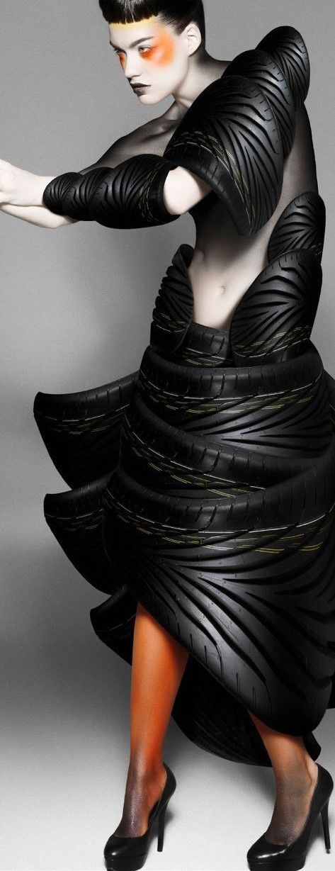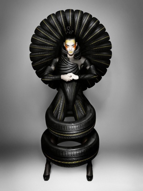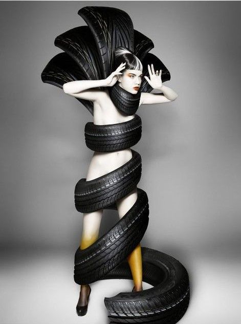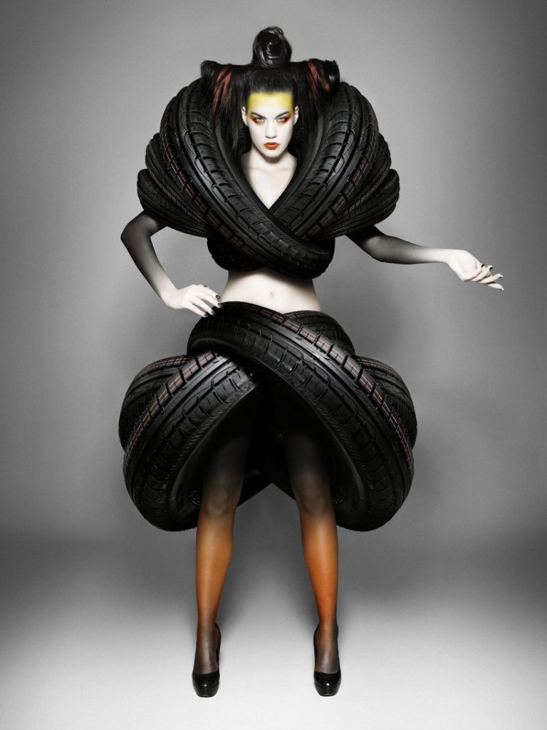 Talk about worn tires. Sorry, that pun was so bad that it made me laugh. The munich-based photography studio Mierswa-Kluska was recently commissioned by Goodyear Dunlop to work in conjuncture with Carl Elkins to develop a photographic series which expresses the major definition points of their product line. Under the artistic direction of Mr. Elkins, tires were transformed into a fashionable armour which speaks to the strength, rusticity, and versatility of Goodyear Dunlop tires. The tires are so versatile, they can be worn!