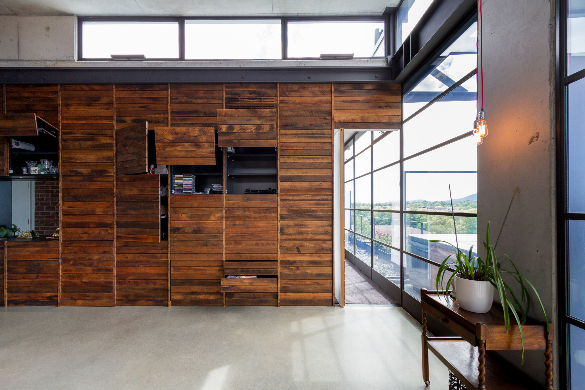 The high levels of interior thermal mass provided by the exposed concrete slab and brick walls assists in passive cooling of the apartment in summer, and allow for some direct thermal gain from morning sun in winter.