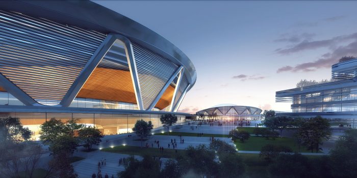 Through the integration of site resources, the combination of sports center functionality requirements with the upper-level planning points creates a ‘three rounds, one band’ formation. ‘Three rounds’, the core group of the masterplan, is formed by uniting the stadium, gymnasium and swimming pool, which strongly reinforces the area as iconic.