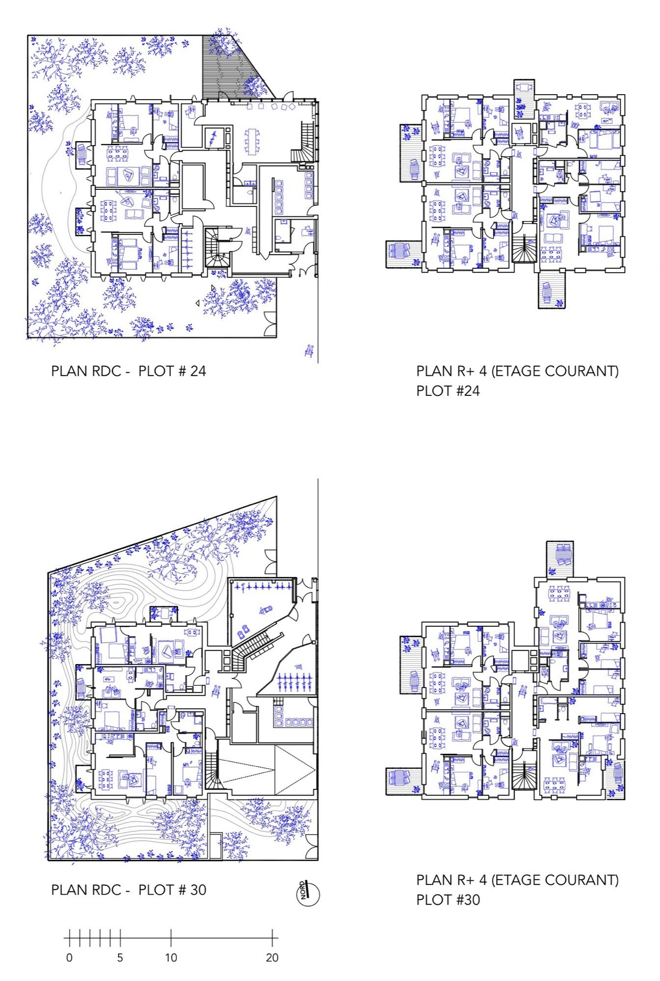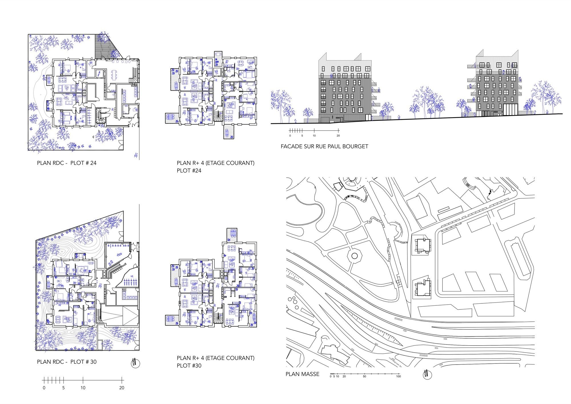 To break the built mass each block is split in two to form four pavilions marked by the sharp contrast of their outer skin materiality.
