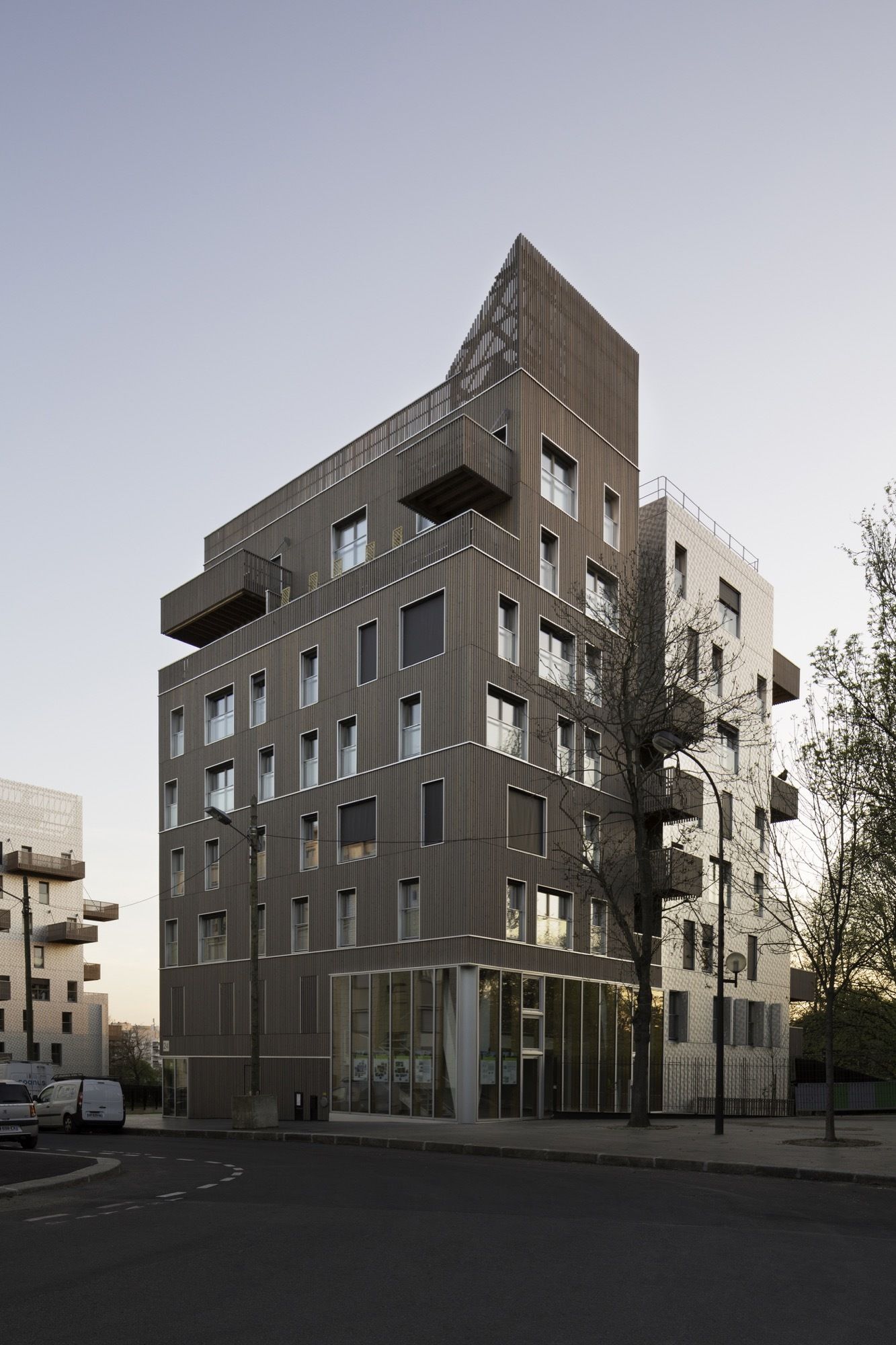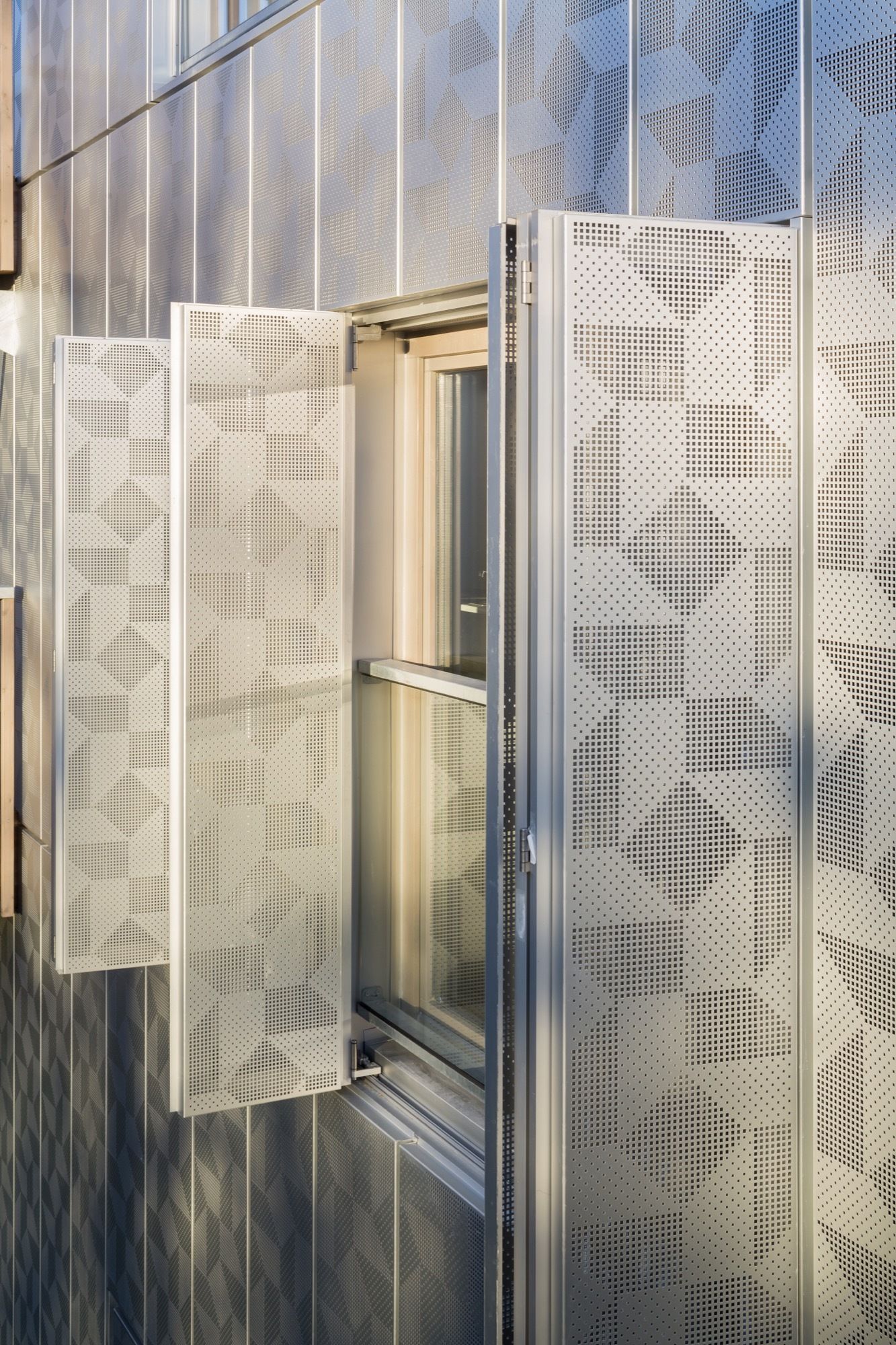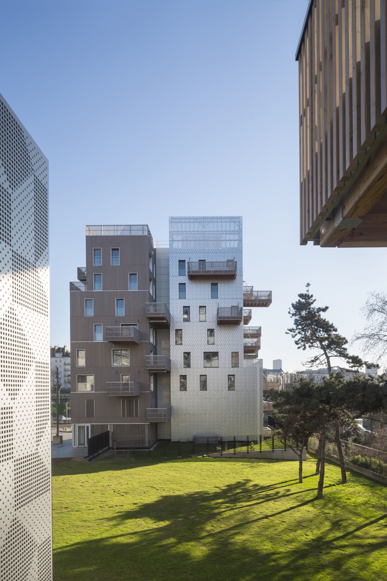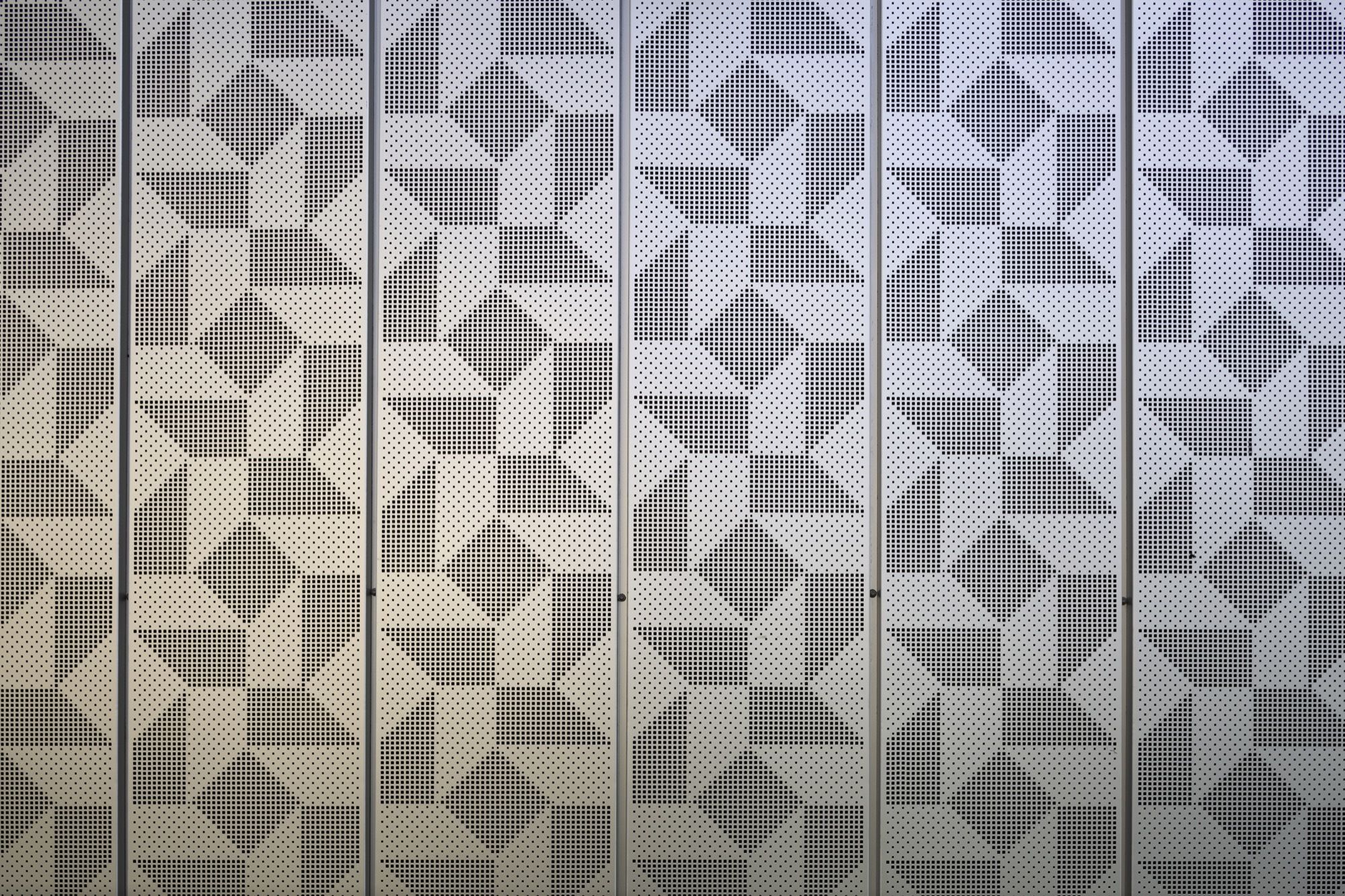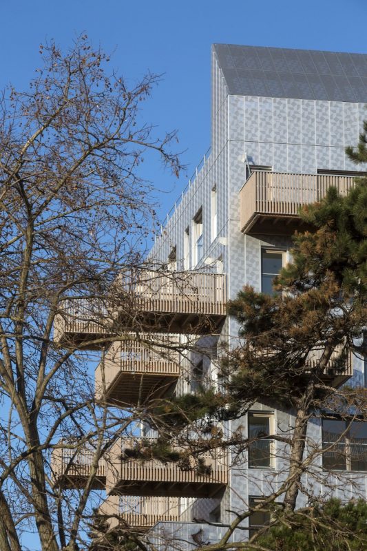 Facing the west: a dress of stainless steel reflecting in the urban skyline atmospheric variations of rain, blue and gray skies or flaming sunsets. The perforated patterns of the steel plates play an active part in breaking down the loud humming of the expressway and its reverberation towards public space. Towards the central garden, fluted larch façades bring the vibrating, sensitive and intimate scale of wood.