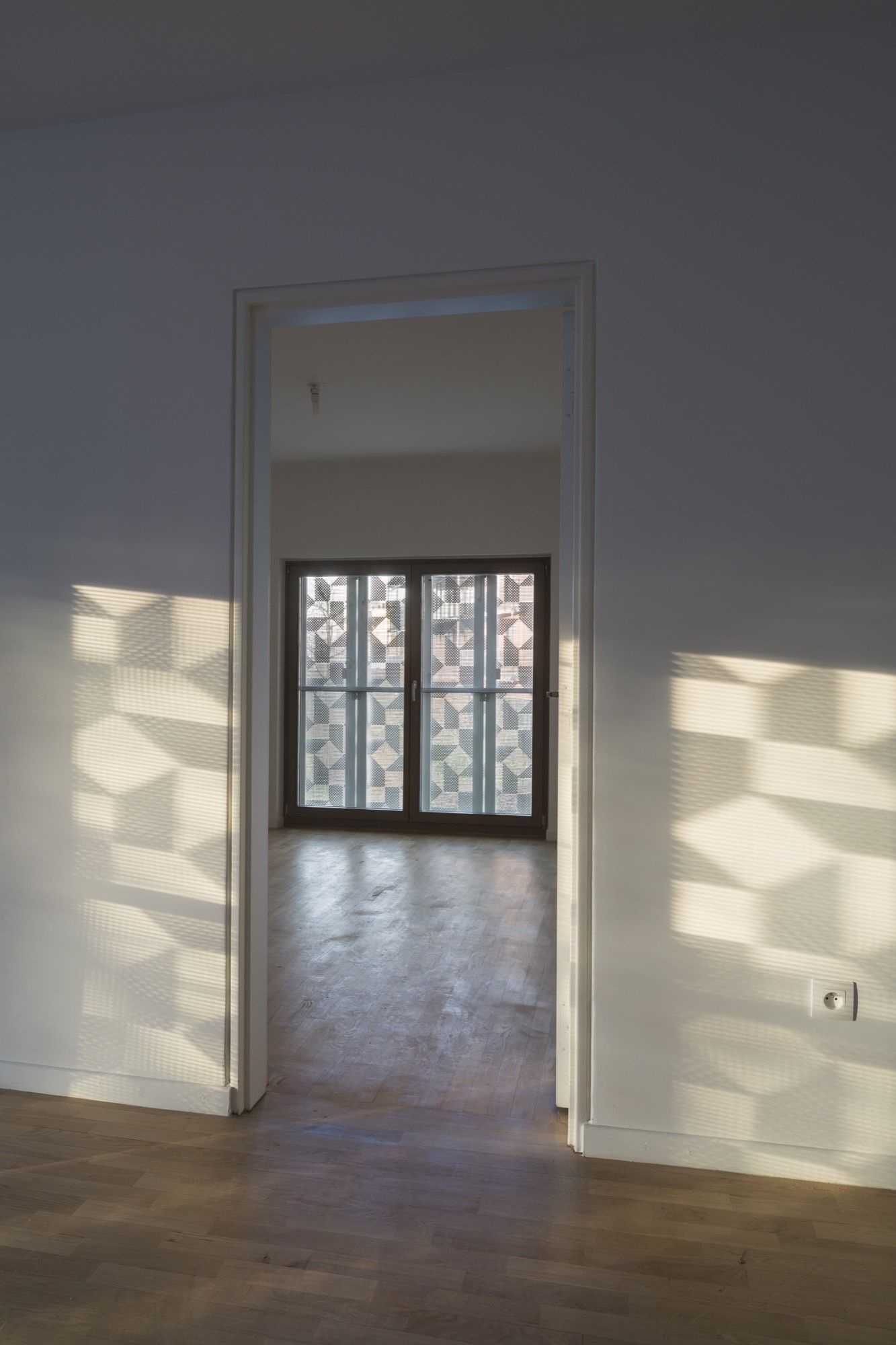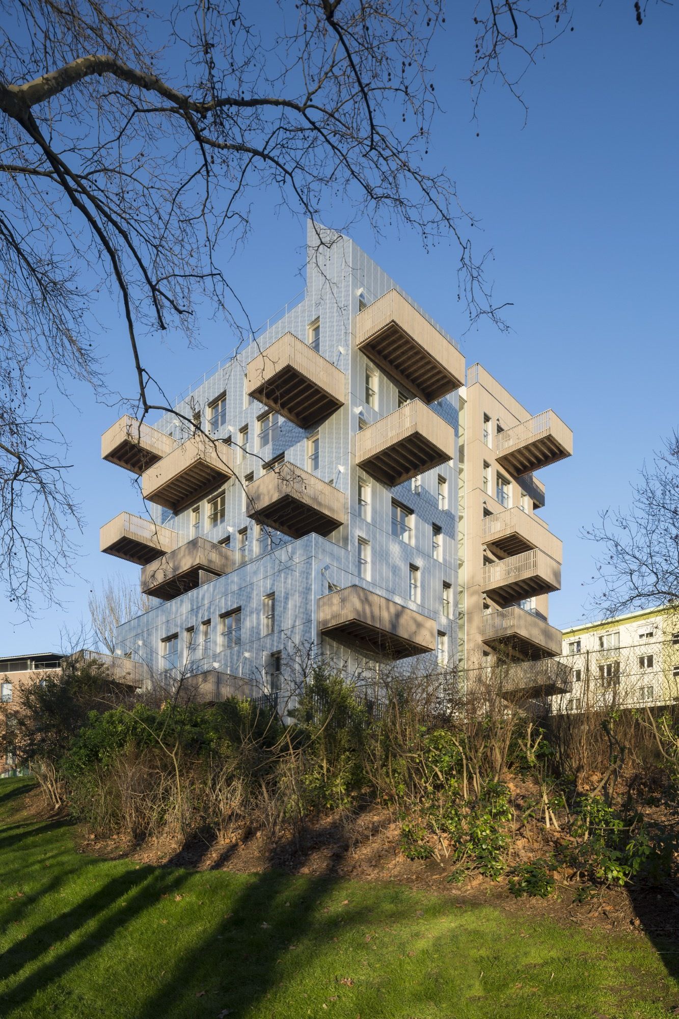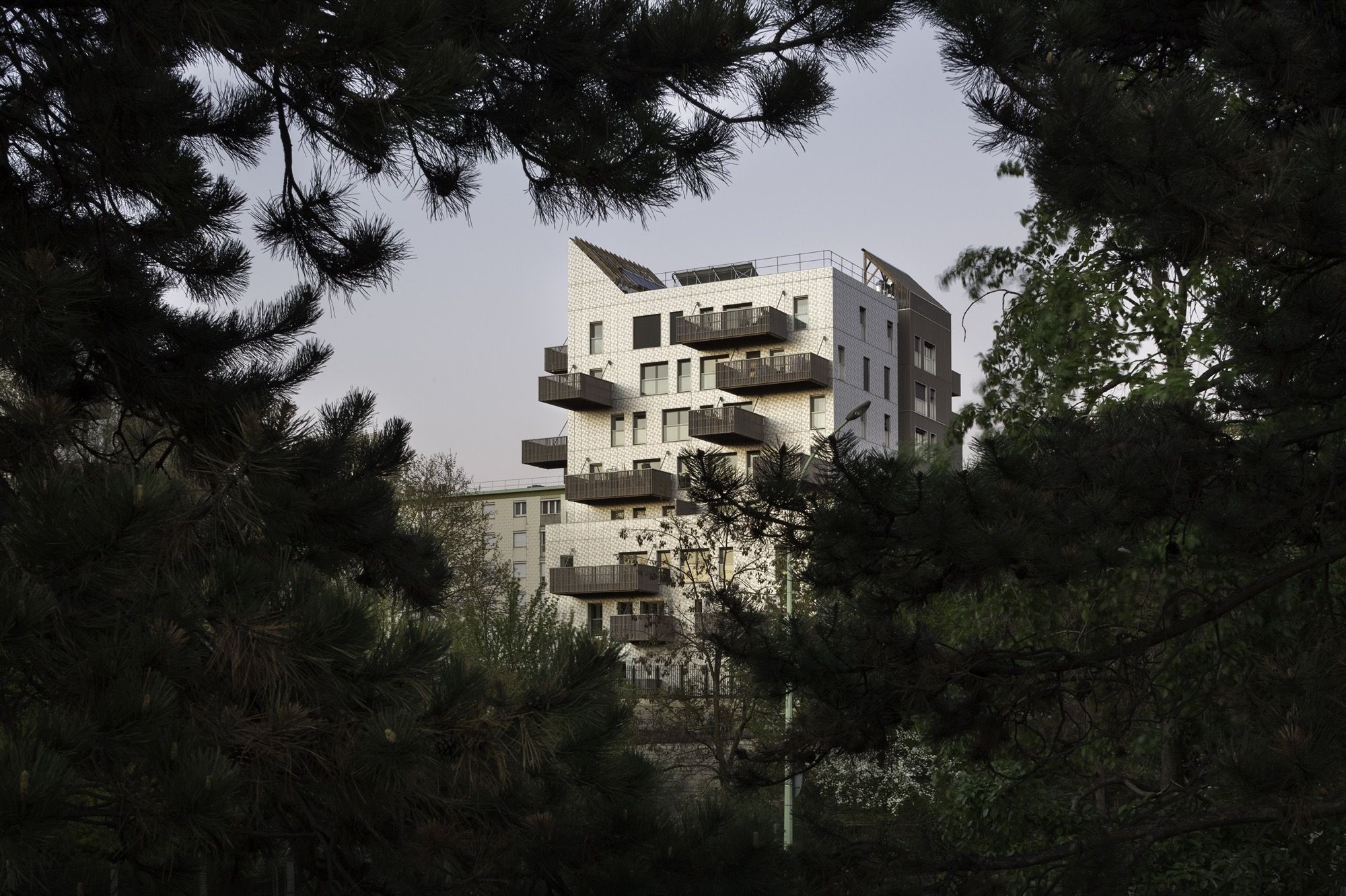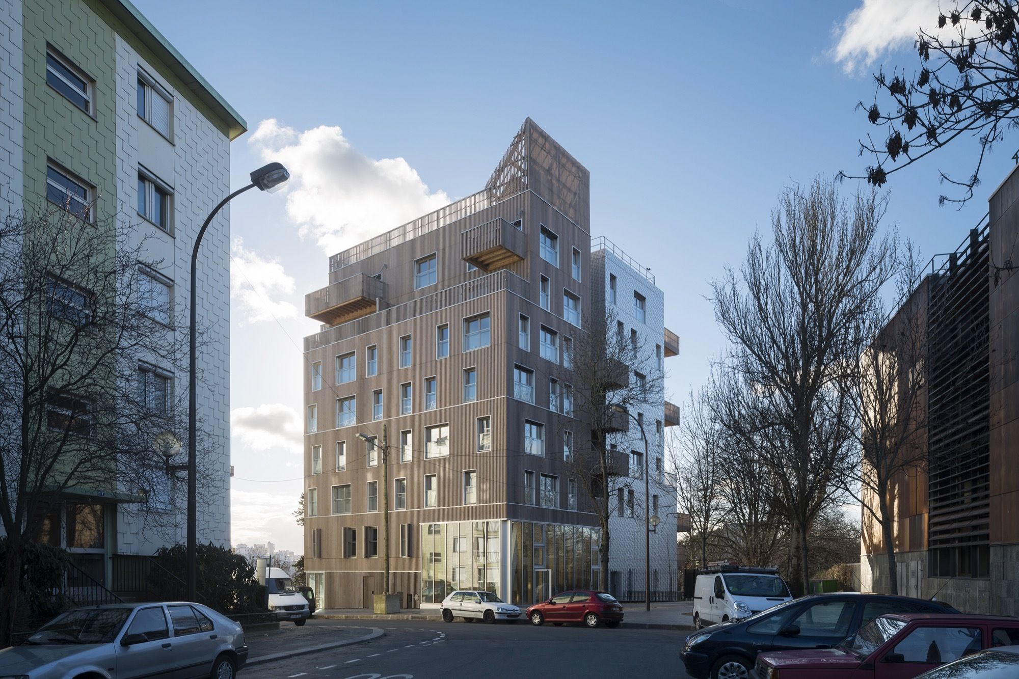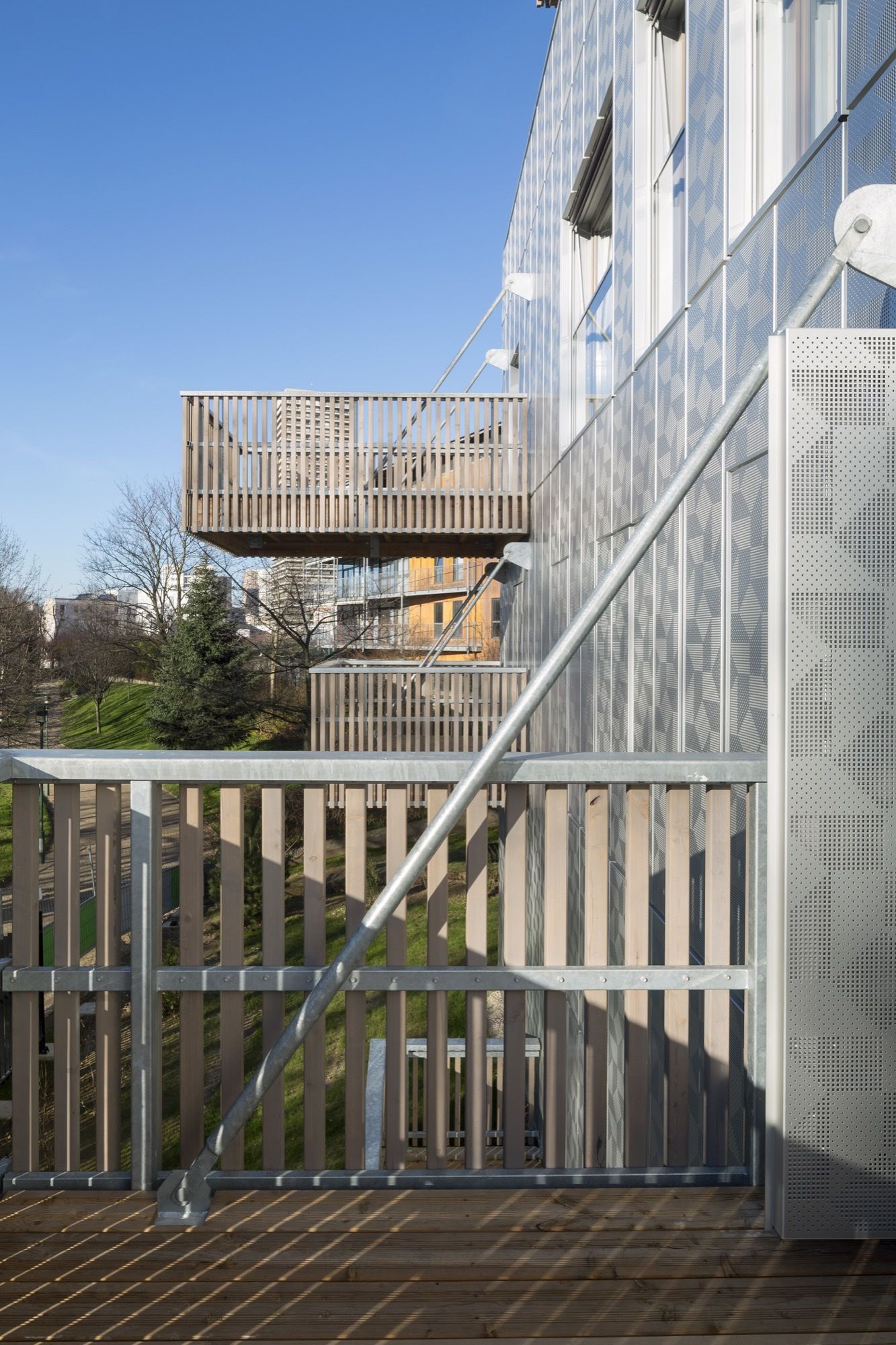 Facing the west: a dress of stainless steel reflecting in the urban skyline atmospheric variations of rain, blue and gray skies or flaming sunsets. The perforated patterns of the steel plates play an active part in breaking down the loud humming of the expressway and its reverberation towards public space. Towards the central garden, fluted larch façades bring the vibrating, sensitive and intimate scale of wood.