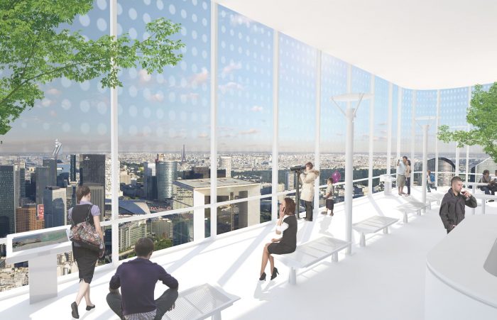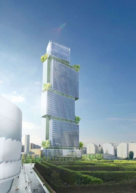 Tour Des Jardins De L’Arche Nanterre, La Defense, Tour of the gardens of the of the Arch street vertical hanging gardens and unprecedented tour of hanging gardens in the heart of the new district of Defense, the skyscraper 200 meters high, at any single point extends the great historic axis of Paris. Through a play of sliding, the superimposed volumes display successively three hotel complexes as well as offices and at the top, a belvedere that can receive the general public or exceptional events.