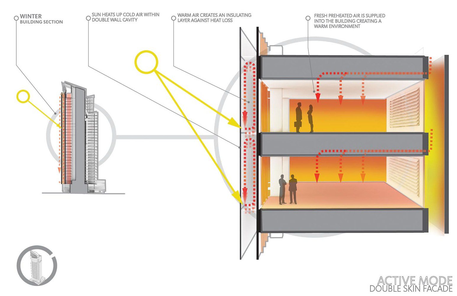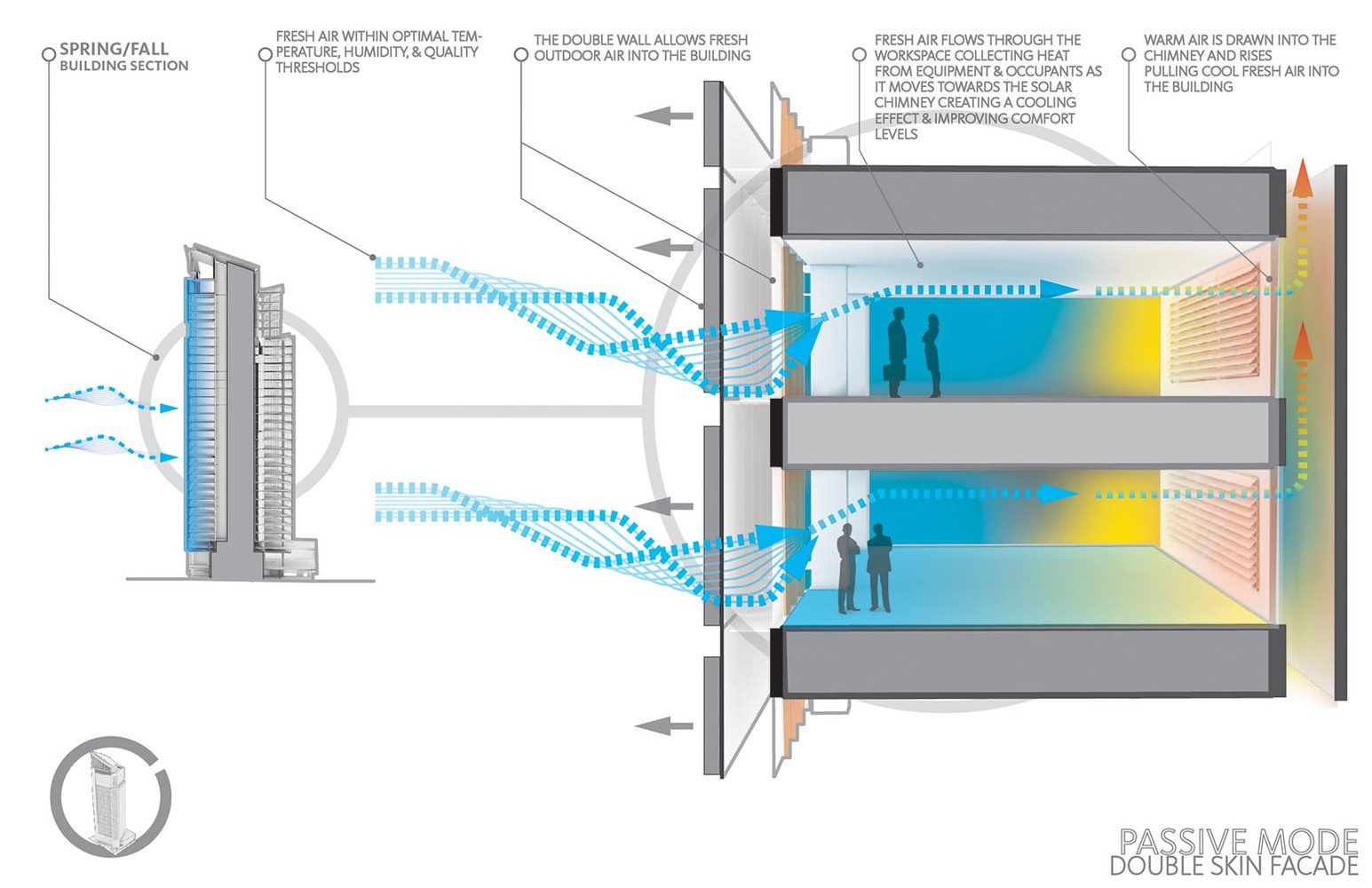 To do this we put the user experience at the forefront of the design process. Our snapshot of the ideal workplace was that of an employee working on a park bench on a sunny afternoon, connected online via a tablet, enjoying the sunlight and abundance of fresh air. Most building designs seek to create optimized interior environments by solely focusing on importing as much daylight as possible. We wanted to go one step further by developing a passive natural ventilation strategy that would bring fresh air into the building, giving workers a true feeling of being outdoors and connected to nature.