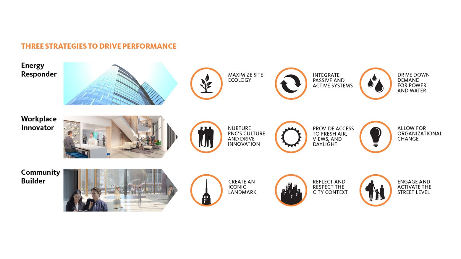 First and foremost, we realized we needed to define what greenest skyrise meant. At the time, the term “green” was almost uniquely focused on LEED standards and energy conservation. This meant that buildings fell into two categories: buildings that were very small and kept their energy footprint similarly small, or more traditional buildings that were large but had a lot of bolt-on technologies to reduce carbon emissions. Neither fit our vision of what The Tower at PNC Plaza could or should be.