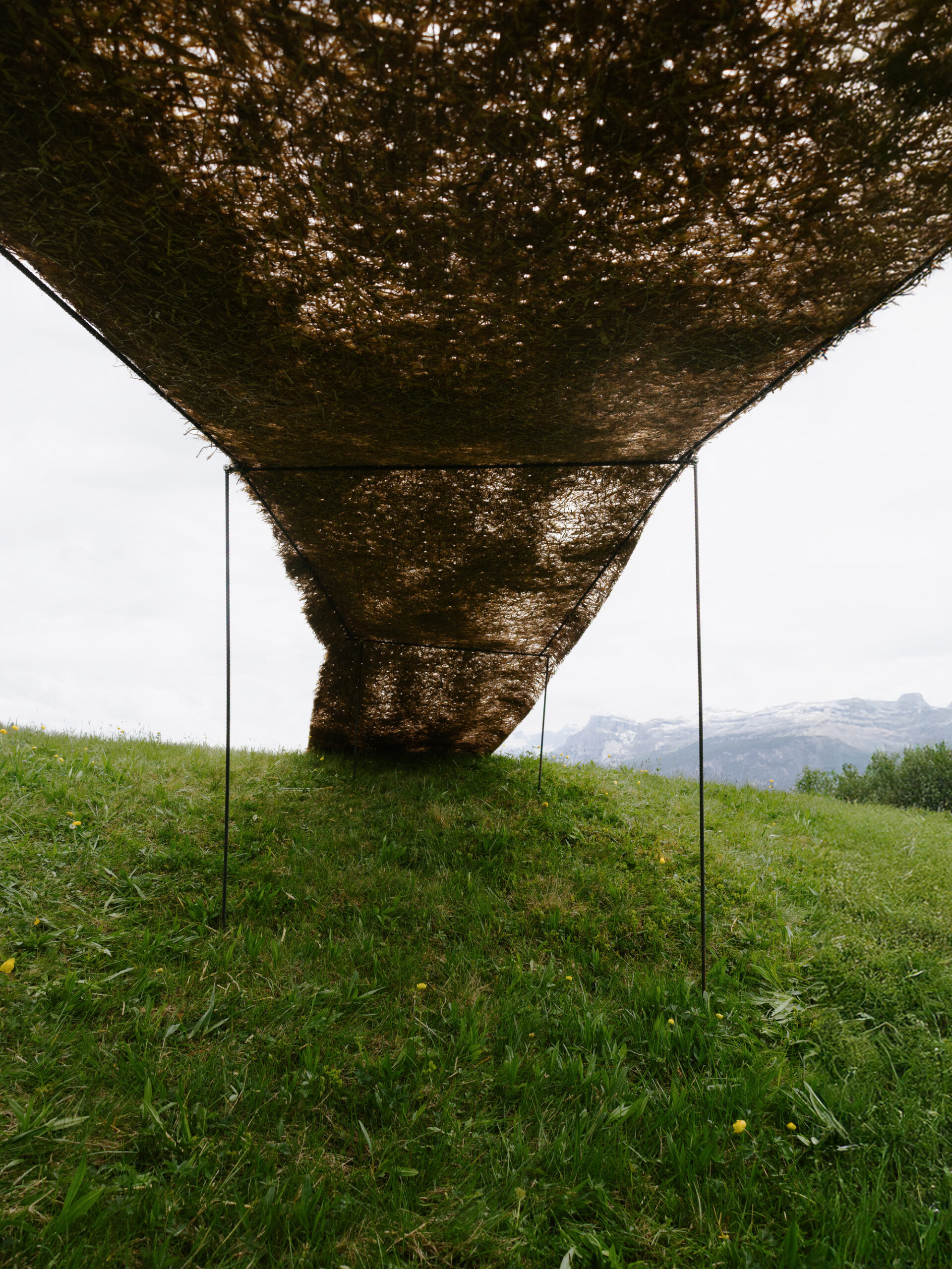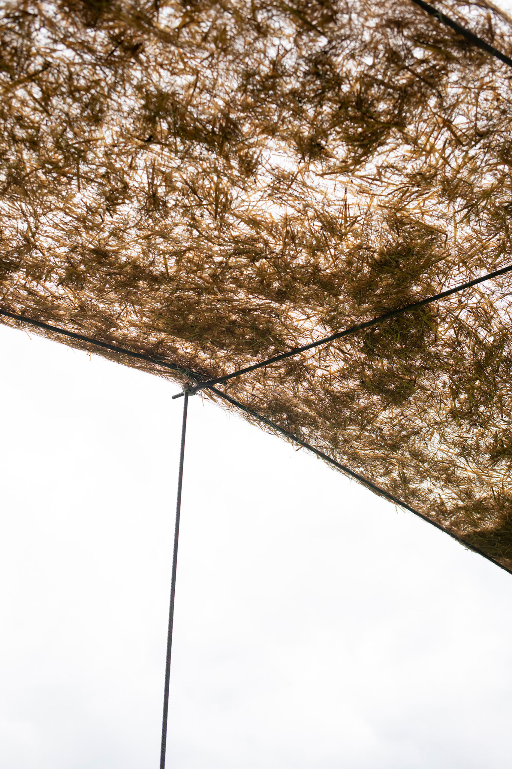 The construction remains minimal and adaptable: vertical rebars are driven into the ground and tied together with horizontal steel rods to form a lightweight frame. A surface of wire mesh supports the unfurled hay, which is bound in place with grass ropes. This simple system ensures a minimal footprint, allowing the canopy to adjust to different terrains and lengths while integrating seamlessly into the pasture. Up close, the hay reveals a tactile texture—fibers layered and porous, filtering light through the canopy to create a presence that feels at once rough and delicate.