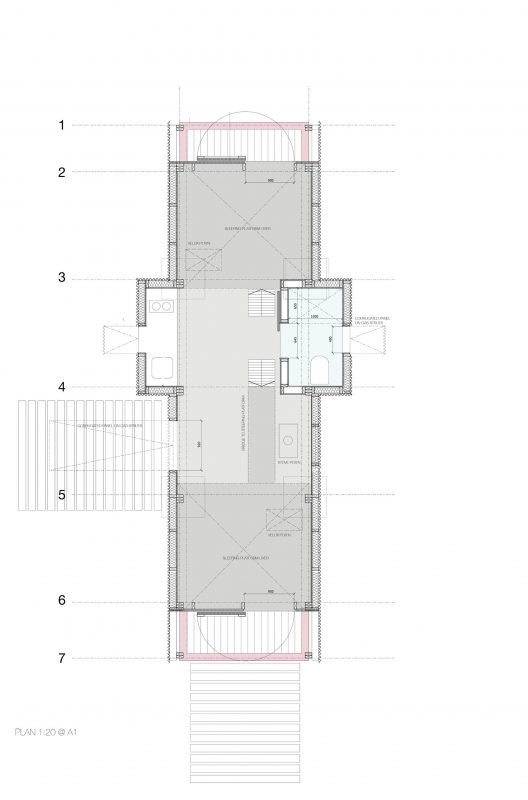 Externally, the trailer is clad in corrugated fiberglass and steel, and internally lined in used but cleaned shuttering ply. All of the joineries is from plywood offcuts, including the 2 staircases. Handrails are made from offcuts of blue rope, left over from Studio in the Woods. High levels of natural light are provided by both gable ends which are ‘glazed’ with high-performance interlocking polycarbonate. The building is insulated with scavenged insulation, the doors were sourced from a skip, and the roof lights were ‘damaged’ and thus trade ‘seconds’.
