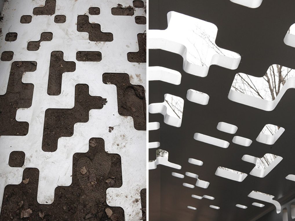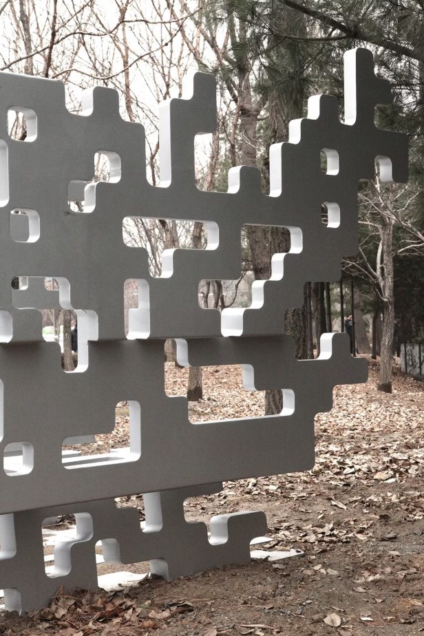 Depending on the visitors’ point of view, the first sculpture [Dispersion 1] gives the illusion of melting into its surroundings through the gradual pixilation of the form. The form, when viewed from the opposite side, appears to solidify into an opaque stainless-steel volume. “Demateriality and surreality from stainless steel will provide visual refreshment and amusement. As a part of a series with dispersion 1, dispersion 2 allows unity to environment of suin line memorial park” Yong describes.