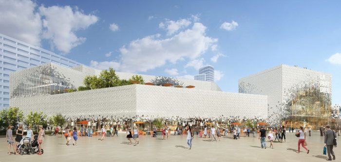 The redevelopment of the Part-Dieu commercial center is an opening act towards the city“, says Winy Maas, “the formerly enclosed and defensive block is peeled open and thus becomes a place for the public to inhabit. Where extensions are added to the building, the pattern of interwoven rectangles will continue over the new envelope eventually ‘evaporating’ as they reach the building entrance, a physical and symbolic gesture to the new opening up of the shopping center. It becomes part of the city“.