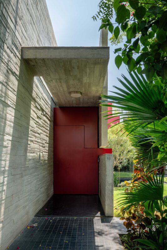 The building is cast from waste in a rough wood shuttering (now registered as an intellectual property of the Architects) that complements the trees in the horizontal cut direction. It has no continuous vertical or horizontal joint that is normally seen in form finished concrete, making the walls into textured planes catching various nuances of the sunlight on them. The floor is in cool, dark Kudapah sand stone, and the moving parts like doors and panels, are cased in terracotta shades. The epitome of this moving feature is a custom-designed main door with counter-rotating top and lower panels, making for an element of delight.
