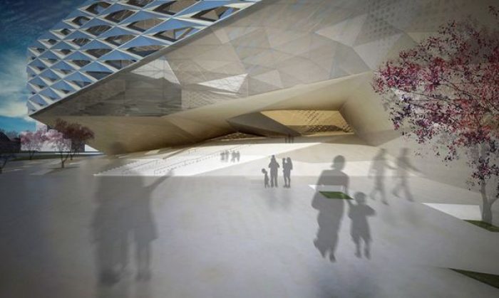 IwamotoScott’s entry for the Busan Opera House design competition titled ‘Trifold Madang’ is recognizable for its triangular voids, and consequently crystalline form. From the architects: ‘Our design research uncovered an interesting spatio-historical aspect of the tradition of opera performance in Korea—that it took place in Madang, or public outdoor courtyard spaces. Our proposal organizes the given tripartite program of the Busan Opera House and its major vertical circulation around three triangular voids.’ The result is triangular shapes of different sizes arranged around a fourth central triangular void that houses the main lobby area. They call this center ‘Public Madang,’ in homage to the tradition of Opera in South Korea that took place outdoors. From IwamotoScott: ‘The building mass is lifted above the surrounding site, supported on three large programmed pedestals the space of the site flows beneath the building and up onto a landscaped podium that culminates in a mound at the Opera House’s center.’