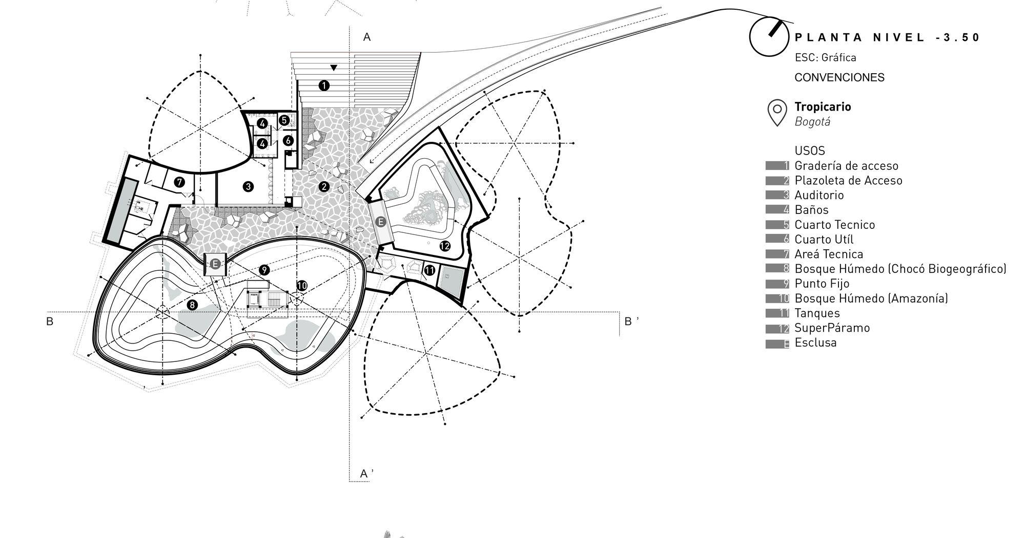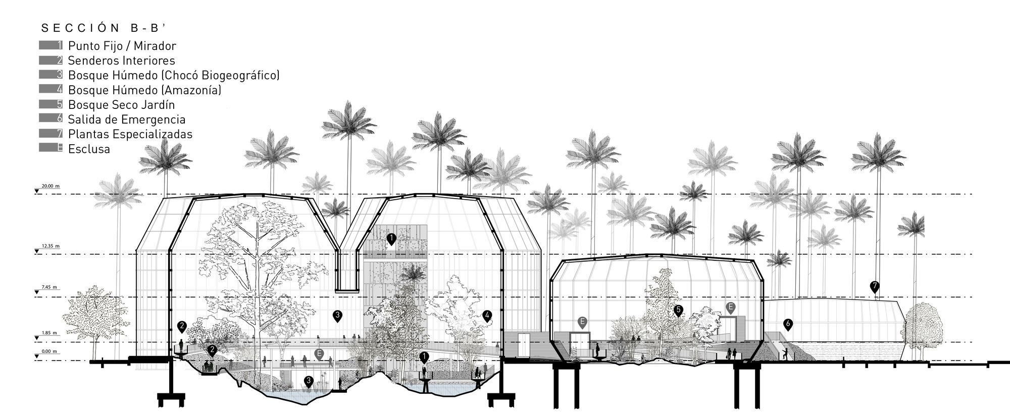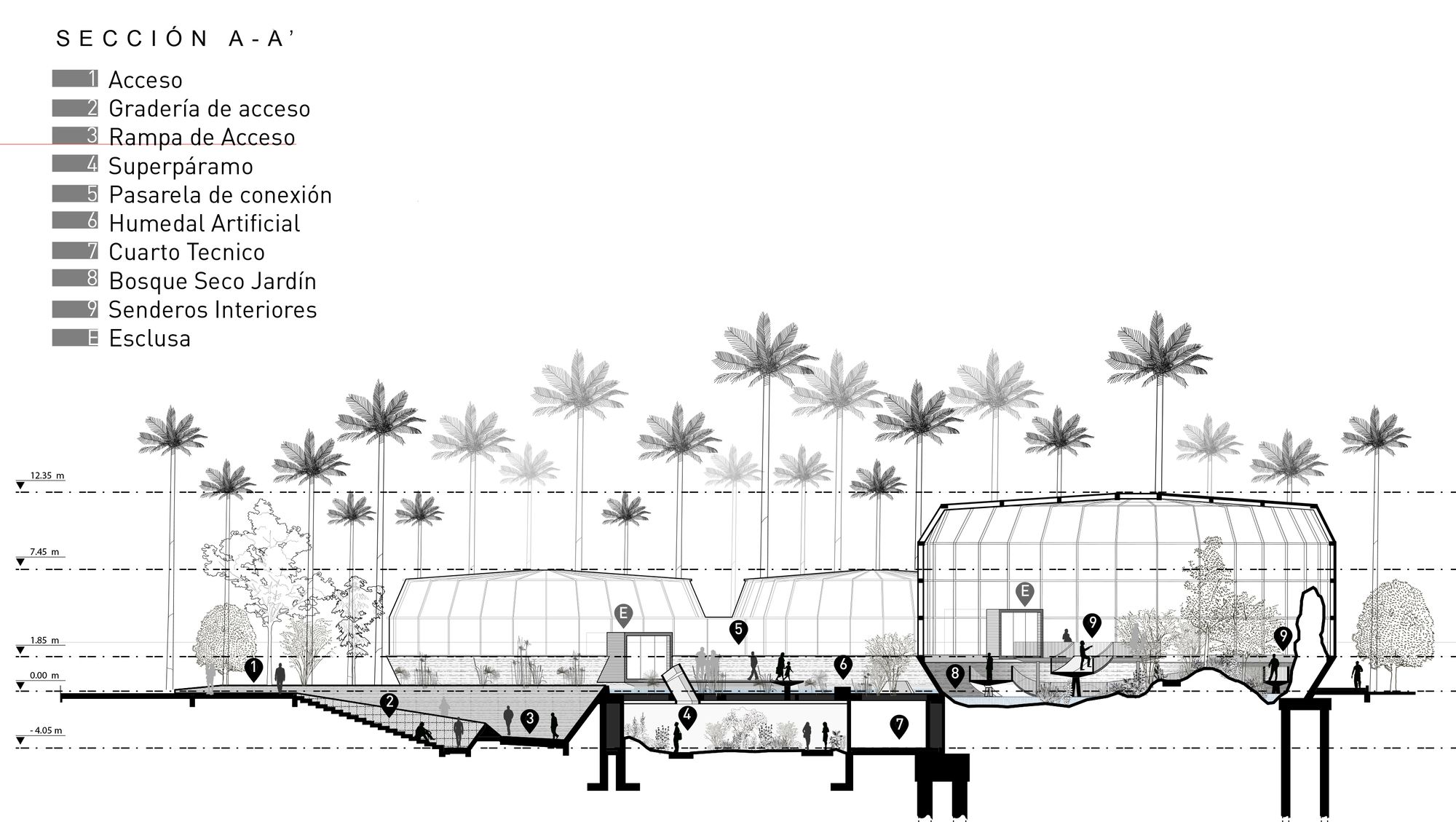 Conceptually, the many parts of the program serve as floating spaces inside a marsh, representing the Bogotá Savanna’s environment. References to pre-Hispanic amphibian architecture (Chinampas, Camellones, Floating Islands) were significant for this. The project is divided into six collections: Humid Forest, Dry Forest, Special Collections, Useful Plants, Superpáramos, and Biodiversity, with height, temperature, and humidity criteria for each. These areas are articulated as “floating” modules by an artificial wetland, a collection presented by the design team during the competition phase.
