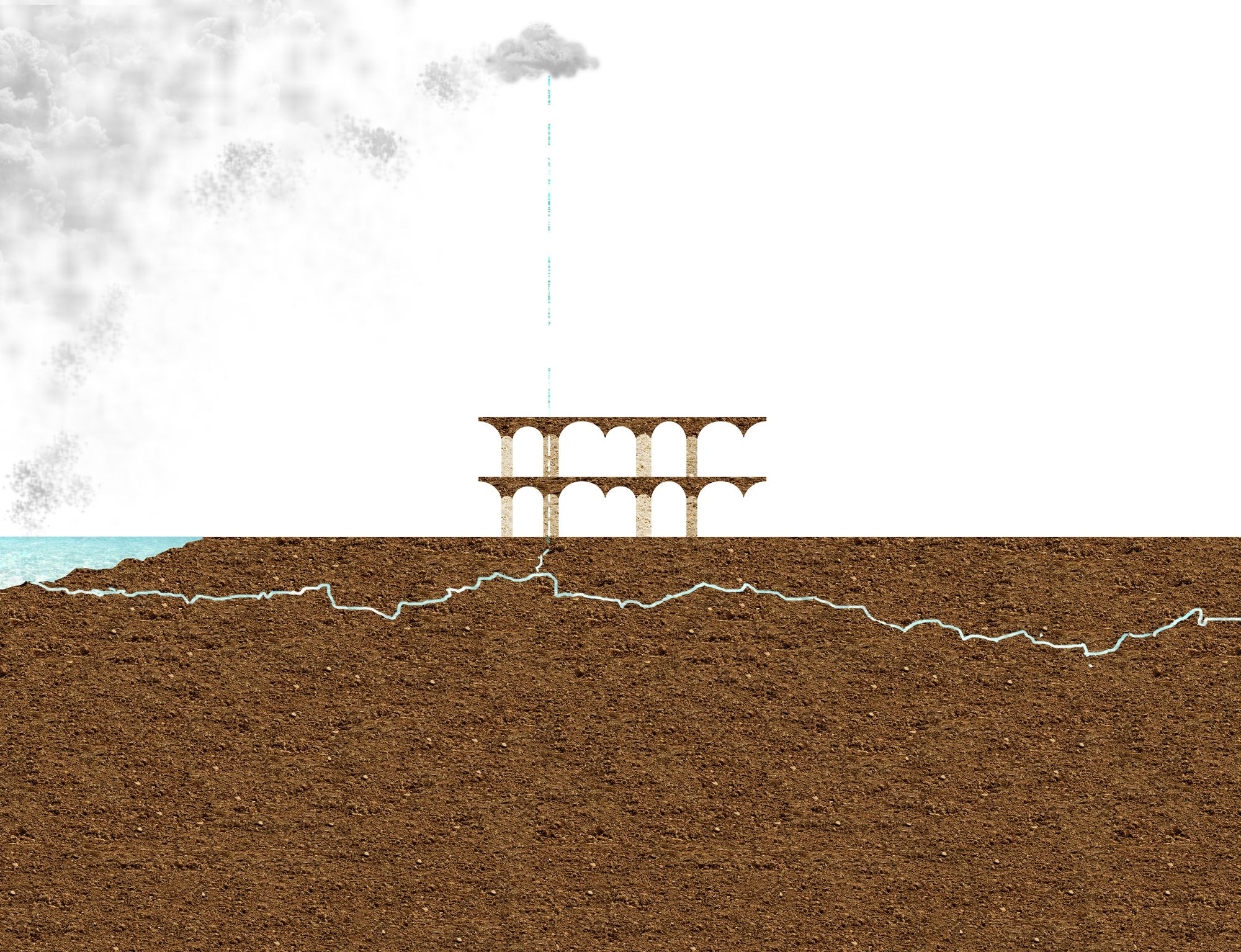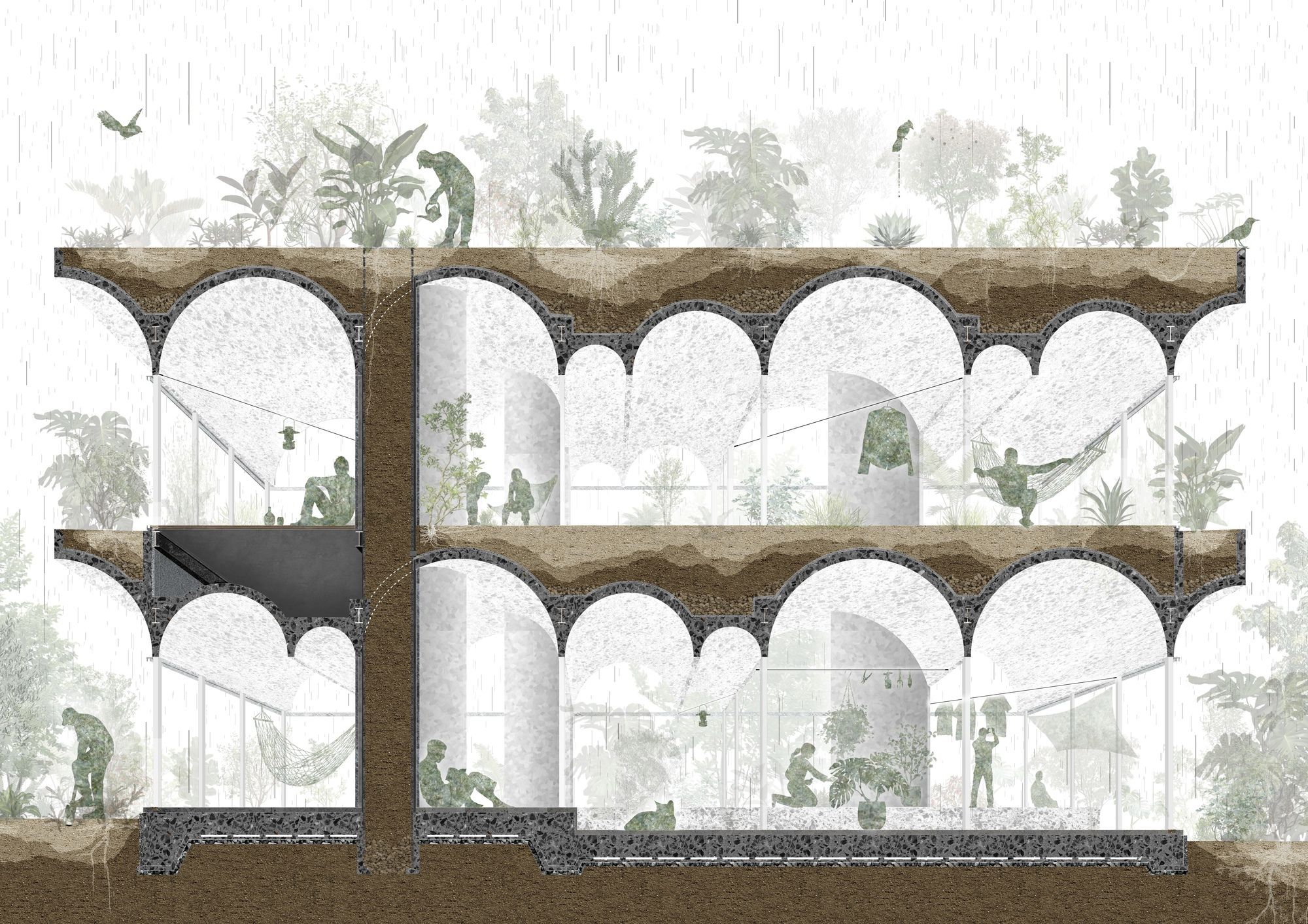 An essential condition to design the environment to support other life forms of inhabitance was clear rainwater drainage in the soil. Following the repeated studies of the cross-section where rainwater naturally falls with gravity, a conclusion arrived at introducing continuous vault slabs. Rainwater flows from mountains to valleys of the vault slabs and is carried vertically from valleys through the core. The water flow generated the shape of the building. This approach is similar to the civil engineering design, such as irrigation channels and dams. The civil engineering design requires determined concentration in hold soil and shed rain efficiently within the harsh natural environment.