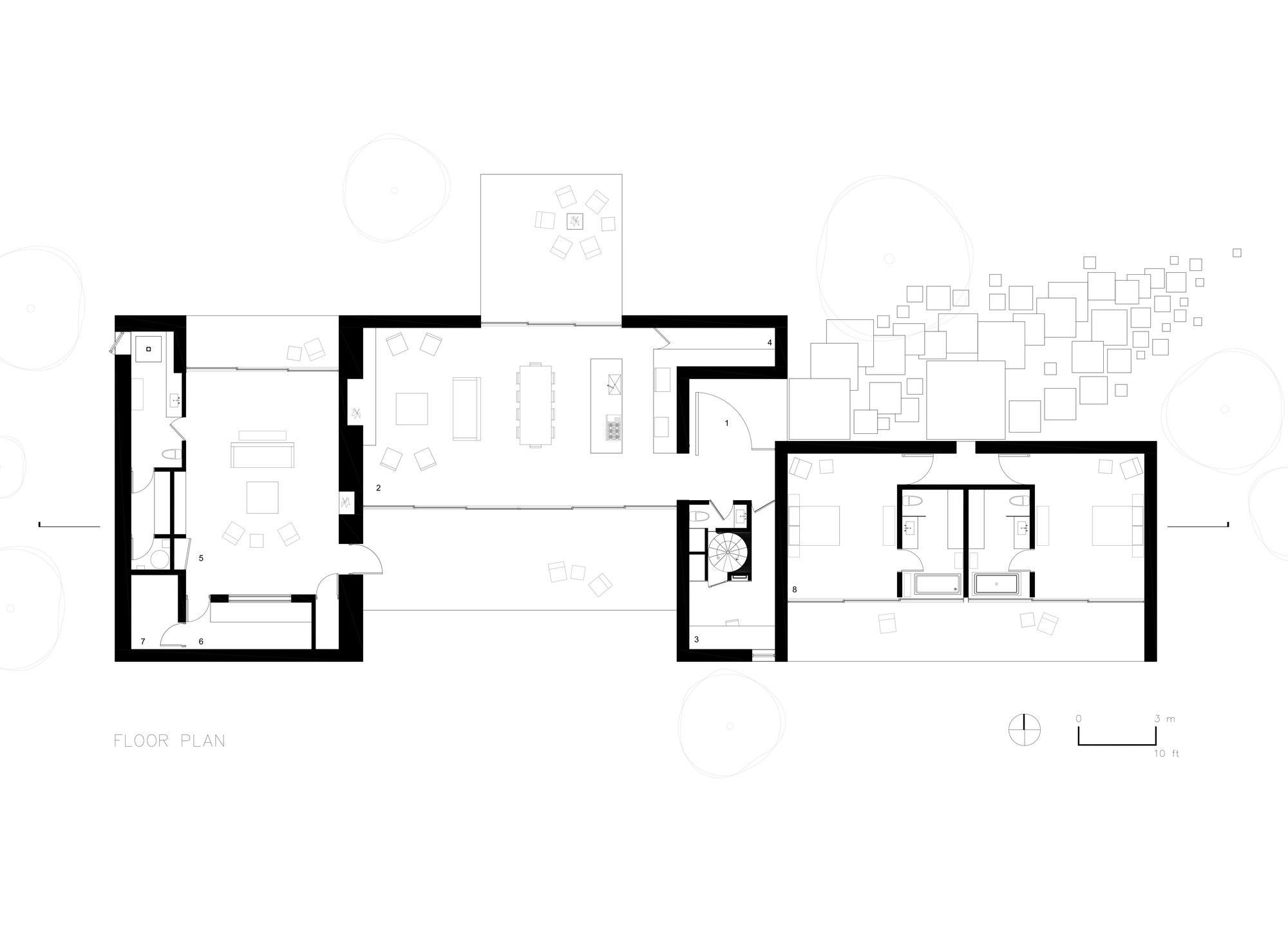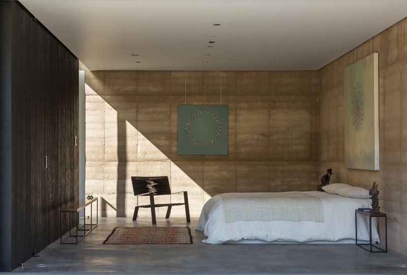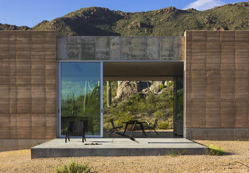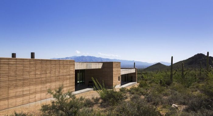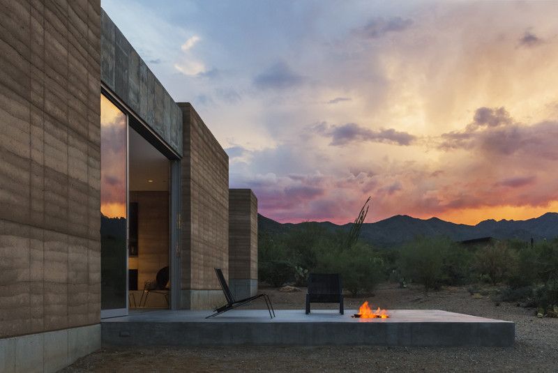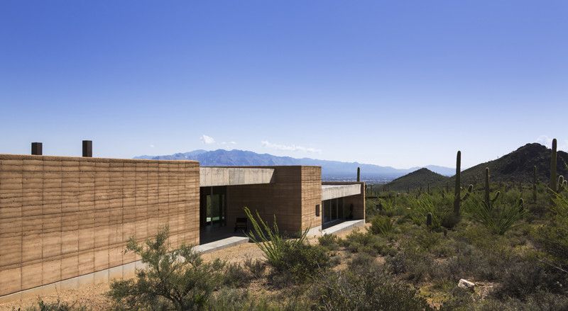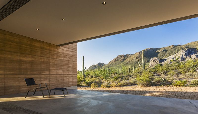 Intentionally isolating the parking over 400 feet from the house, one must traverse and engage the desert by walking along a narrow footpath toward the house, passing through a dense clustered area of cacti and Palo Verde that obscure direct views of the home Upon each progressive footstep, the house slowly reveals itself, rising out of the ground. The entry sequence, a series of playfully engaging concrete steps, dissolves into the desert. As one ascends, each step offers an alternative decision and a new adventure. Through this process, movement slows and senses are stimulated, leaving the rush of city life behind. The home is primarily made of Rammed Earth, a material that uses widely available soil provides desirable thermal mass and has virtually no adverse environmental side effects. Historically vernacular to arid regions, it fits well within the Sonoran Desert, while at the same time it embodies inherent poetic qualities that engage the visual, tactile and auditory senses of all who experience it.