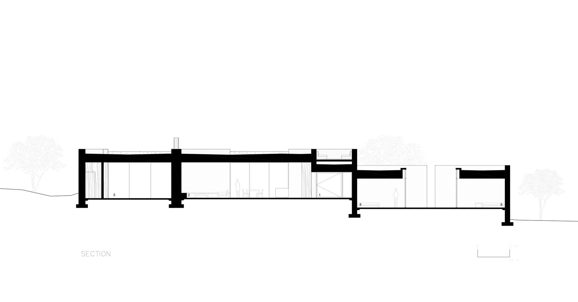 Solar heat gain is reduced by orienting the house in a linear fashion along an east-west axis, and by minimizing door and window openings in the narrow east and west facades. The main living and the sleeping spaces extend into patios and open toward the south under deep overhangs that allow unadulterated views and access to the Sonoran Desert. The overhangs provide shelter from the summer sun while allowing winter sunlight to enter and passively heat the floors and walls. They also scoop prevailing southerly breezes and enhance cross ventilation, which can be flexibly controlled by adjusting the floor-to-ceiling sliding glass doors. When the large glass doors are fully opened, the house is transformed, evoking a boundless ramada-like spirit where the desert and home become one.