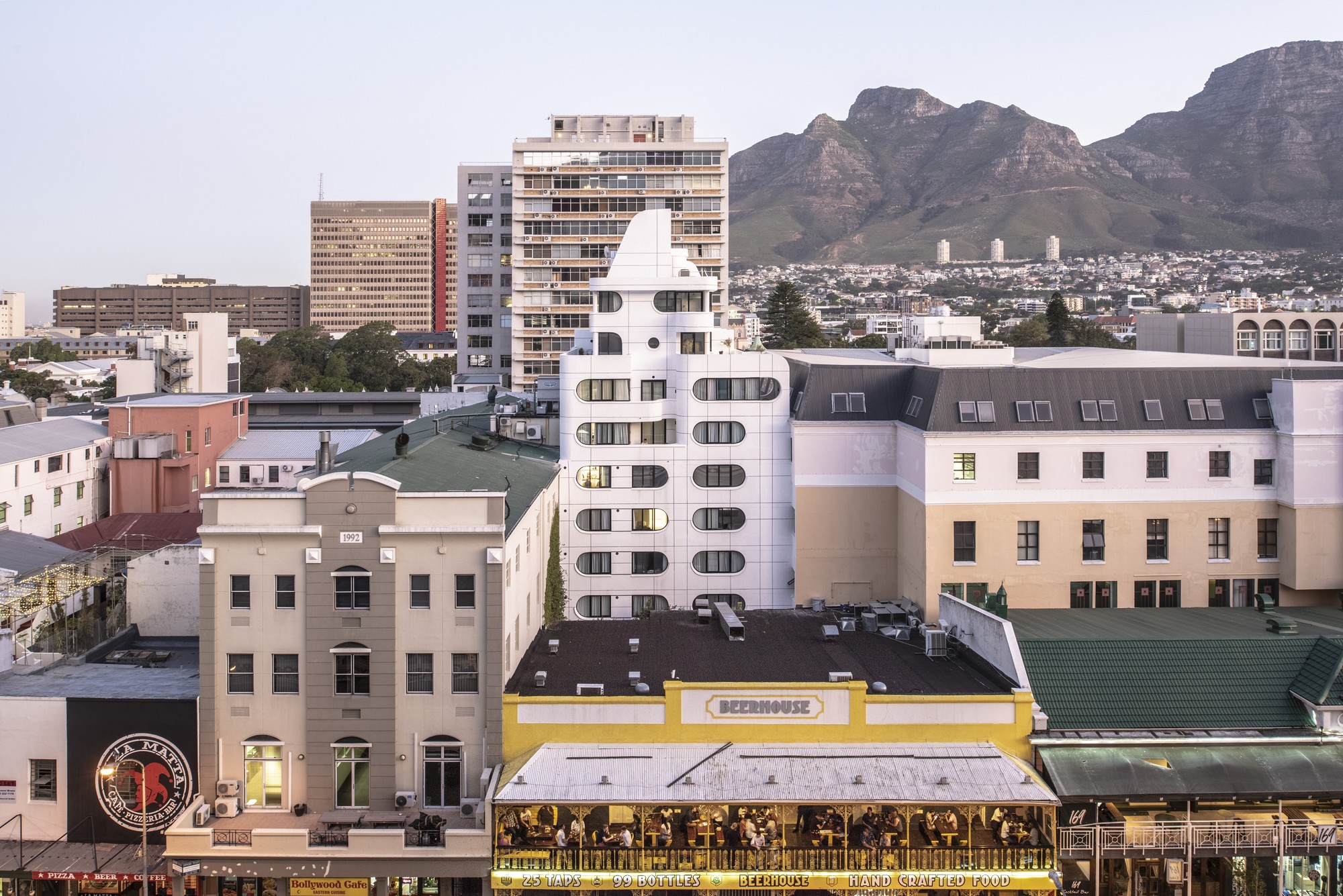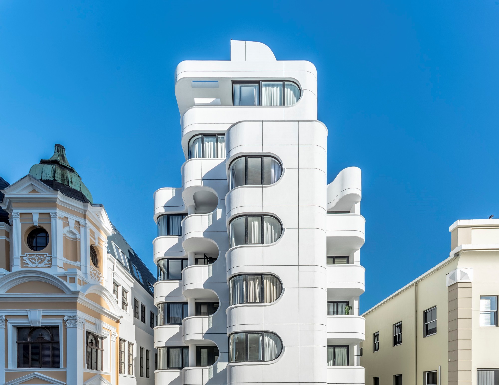 Tuynhuys is a futuristic new block of 47 new apartments in the heart of Cape Town’s old city legal district – directly opposite the Cape High Court. Set in a stoic row of Victorian and Cape Dutch commercial buildings, this playful and exuberant (but never irreverent) new residential building proves that innovative modern high-rises are indeed possible (and even desirable) in the most sensitive of historic locations.